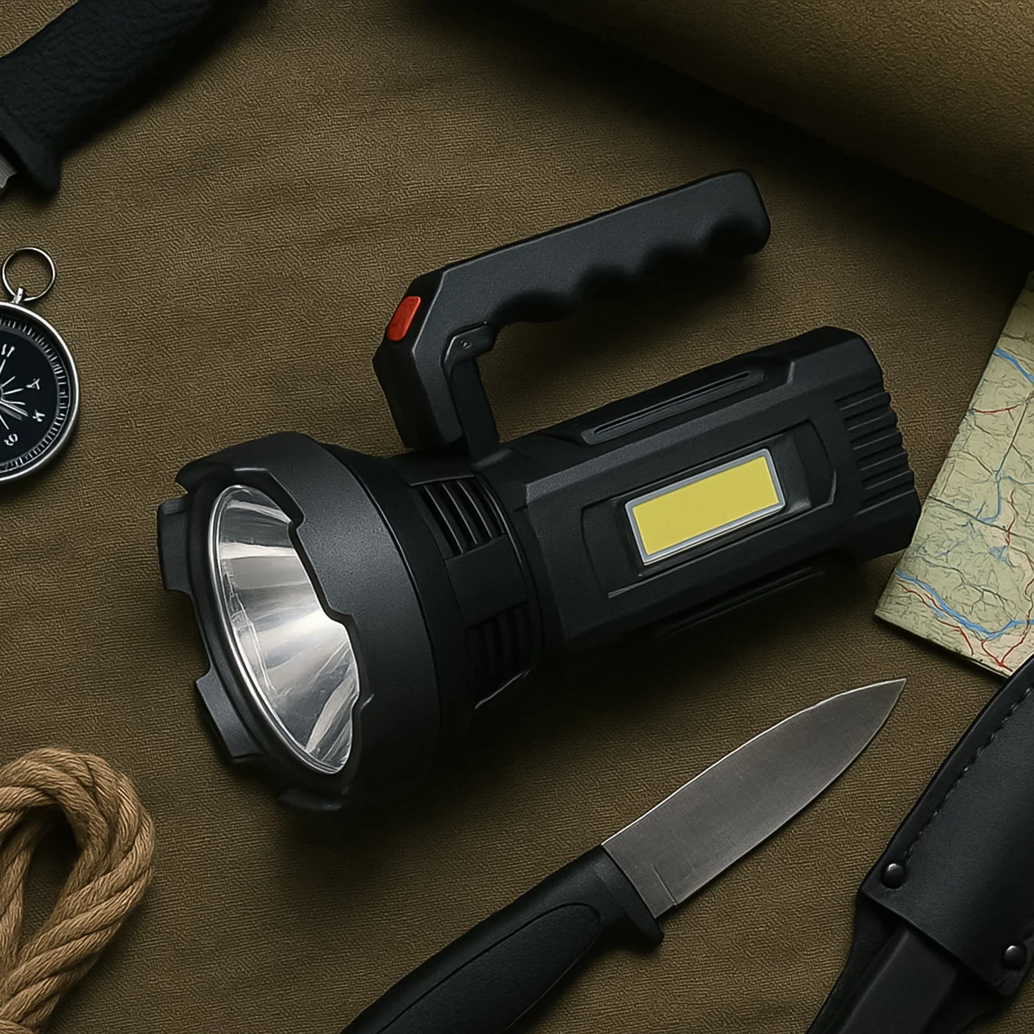 Heavy-Duty Rechargeable USB LED Hand Torch with COB Side Light Grip – Multipurpose Search Light for Outdoor, Camping, and Emergency Use