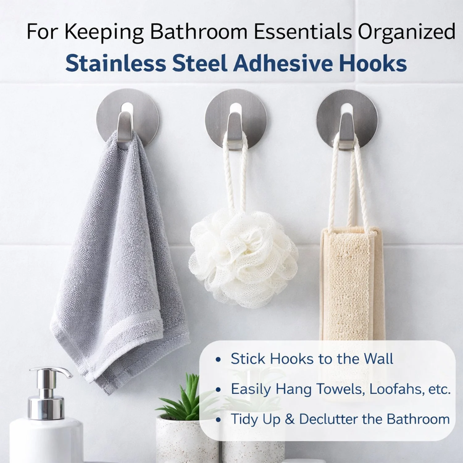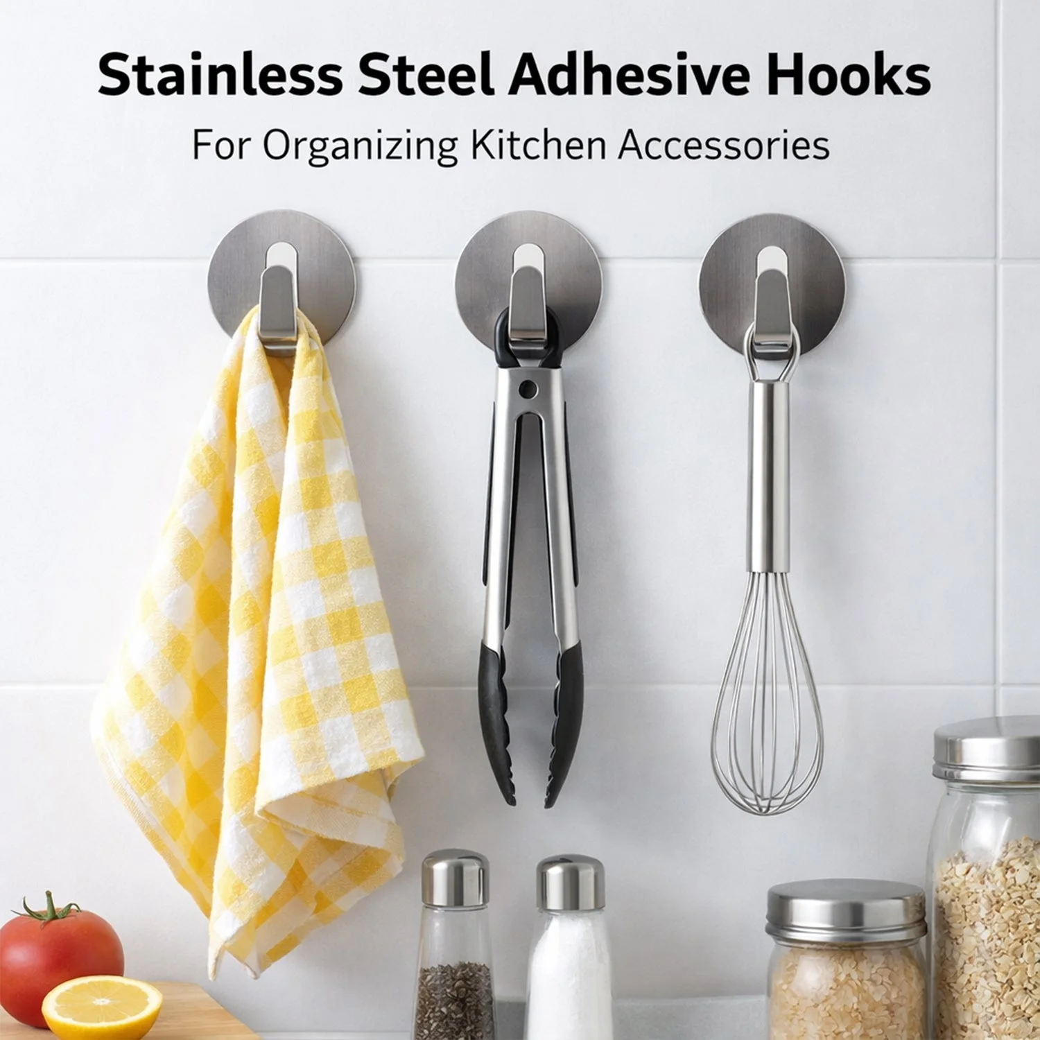 Self-Adhesive Hooks, Heavy Duty Wall Hooks Hangers Stainless Steel Waterproof Sticky Hooks for Hanging Robe Coat Towel Kitchen Bathroom