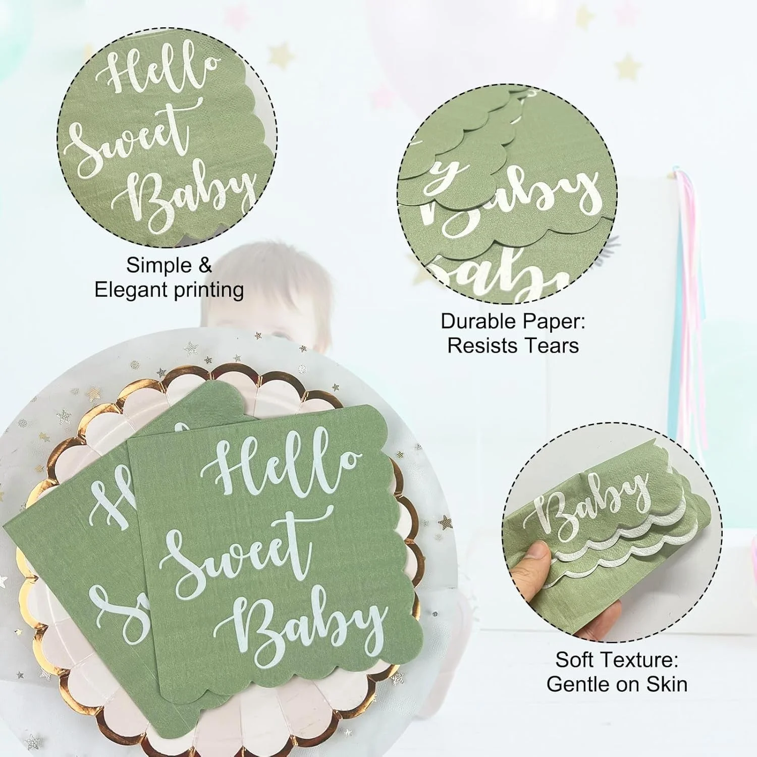 • Charming Design: Features a delicate mint green color with “Hello Sweet Baby” text and scalloped edging for an elegant look.