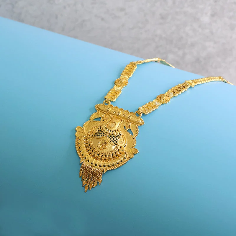 Designed with ornate motifs and intricate cutwork, this heritage-inspired necklace set reflects the beauty of traditional Indian craftsmanship. The bold pendant and coordinated earrings create a striking ensemble ideal for festivals, poojas, family functions, and special celebrations. Its radiant gold-plated finish enhances the richness of ethnic attire while offering a sophisticated statement appearance. Perfect for those who love culturally inspired jewelry that stands out with elegance and grace.