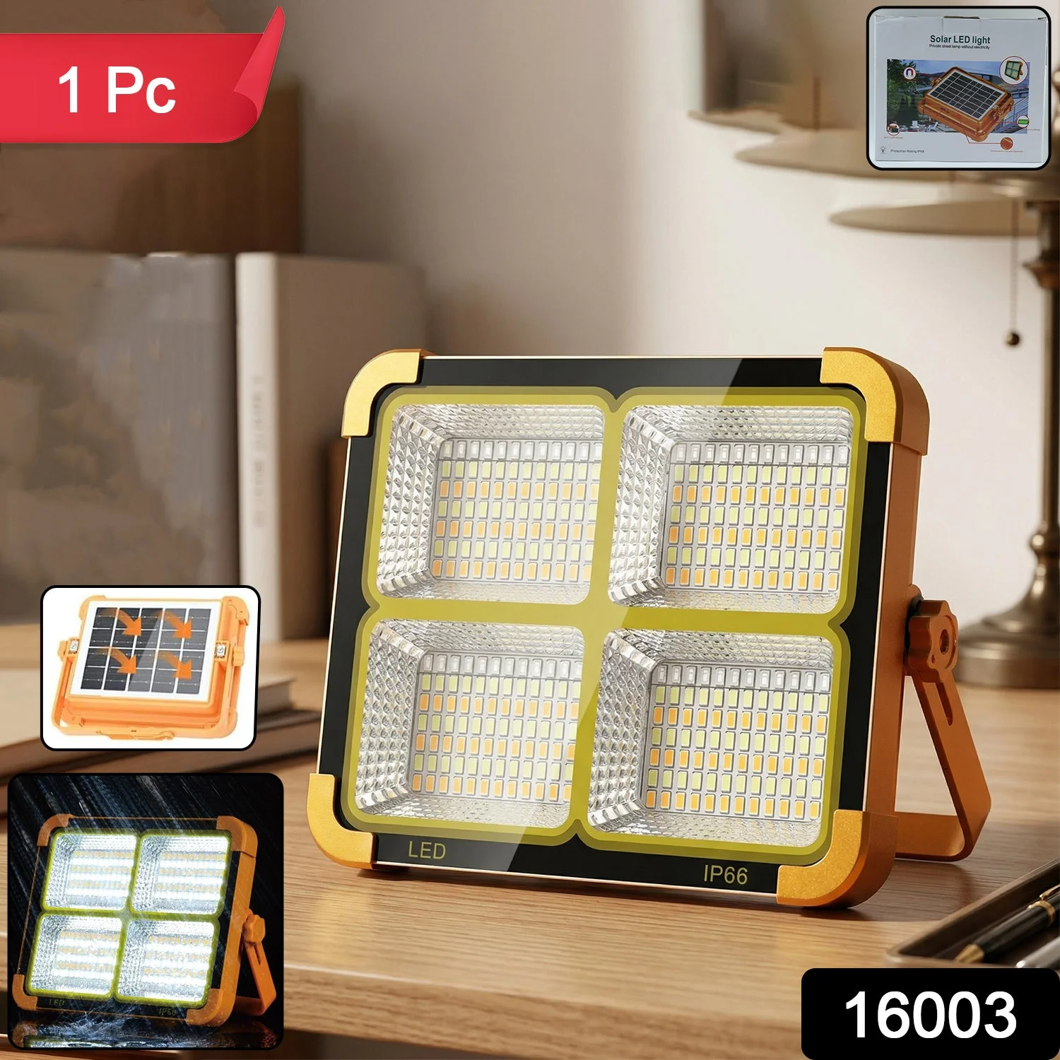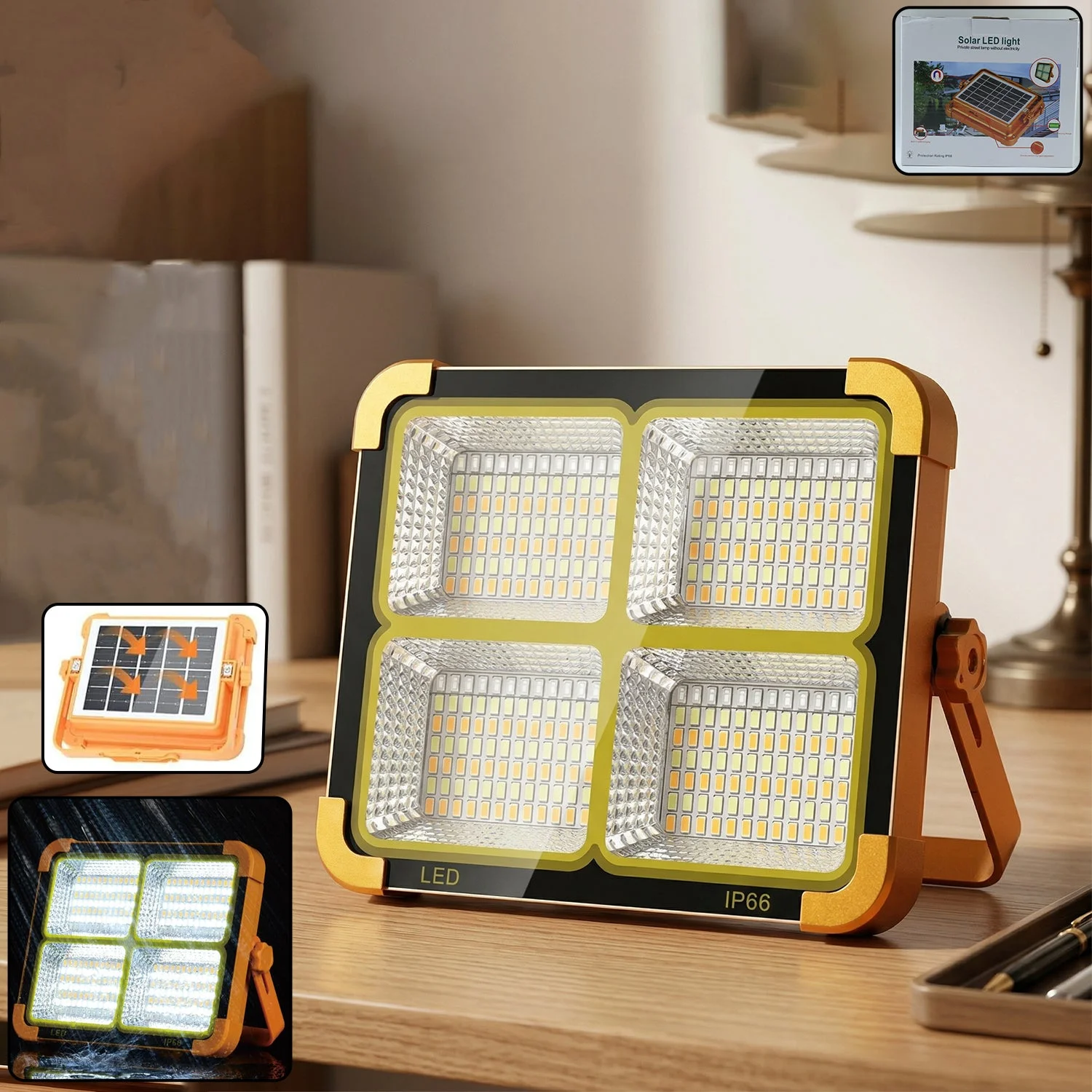 Illuminate your surroundings efficiently with this high power solar LED flood light designed for both indoor and outdoor use. Equipped with multiple LED panels, it delivers bright and wide-angle illumination, making it ideal for emergency lighting, outdoor activities, and security purposes. The built-in solar panel allows convenient charging during the day, ensuring energy-saving and eco-friendly performance. Its sturdy design with an adjustable stand enables flexible positioning, while the waterproof construction ensures reliable operation in various weather conditions. A versatile lighting solution, it provides dependable brightness whenever and wherever needed.