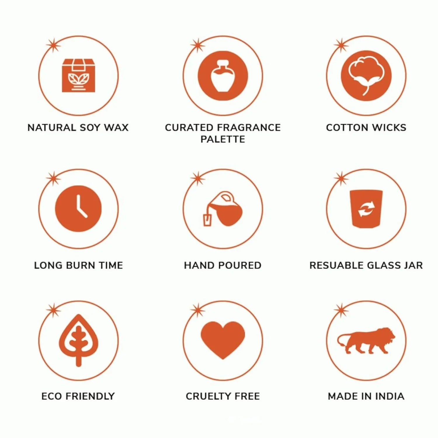 Care: Trim wick to ~5–7 mm before each use; burn on heat-safe surface; keep away from drafts, children & pets; do not burn >3 hours at a stretch; never leave unattended.