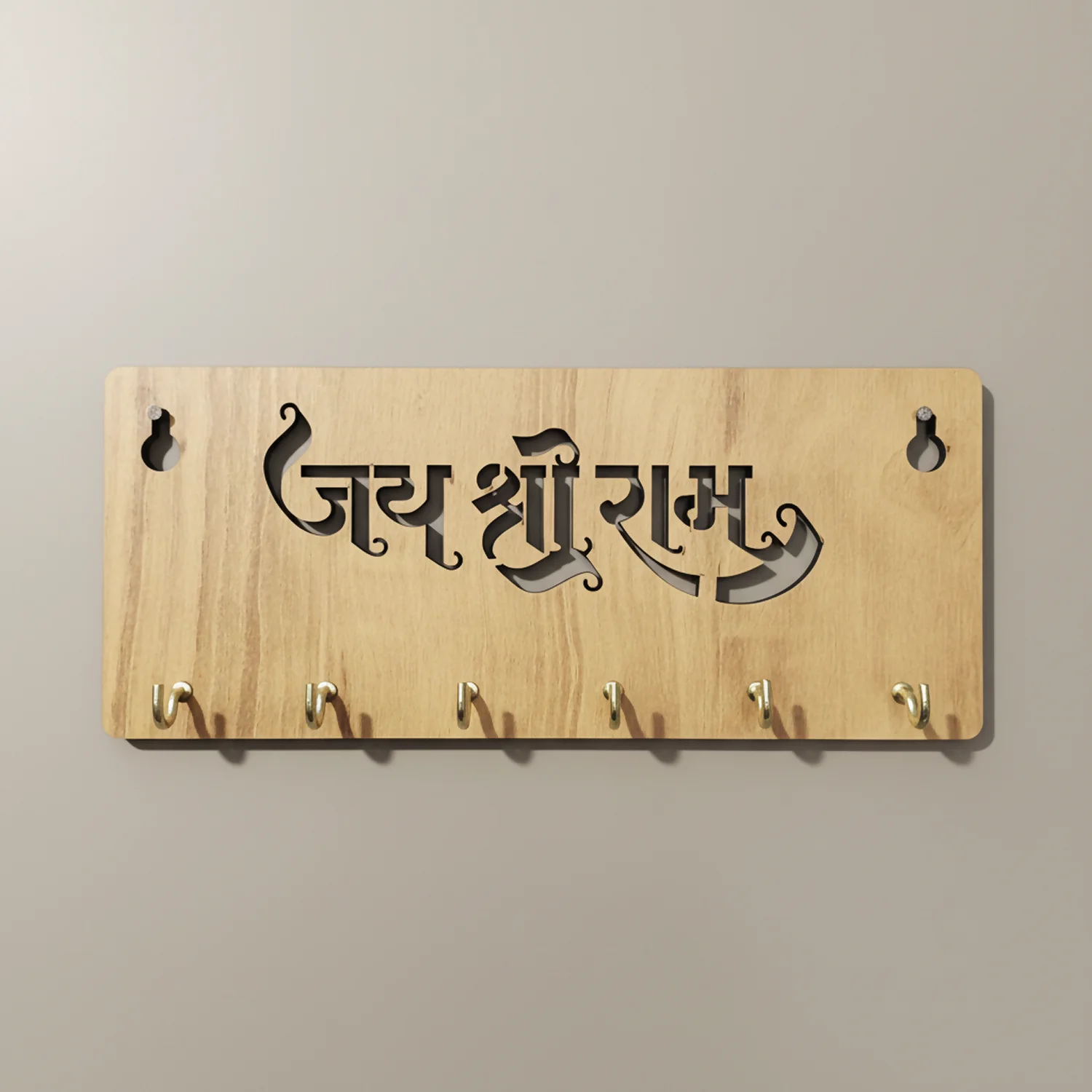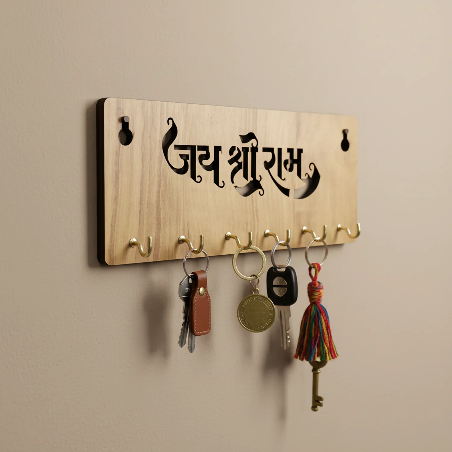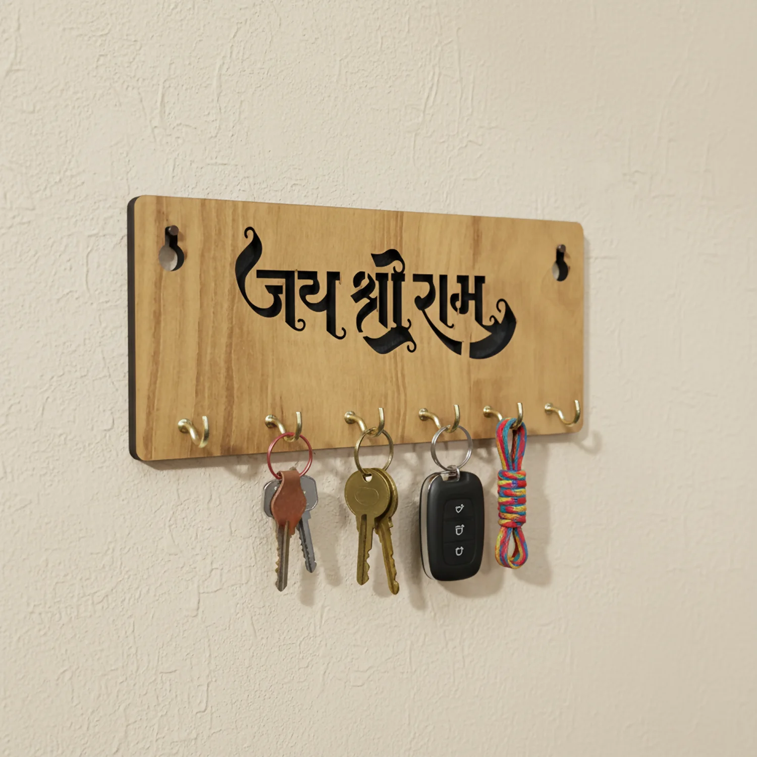 The elegant Hindi typography of “जय श्री राम” adds a powerful yet serene presence, making it ideal for entryways, living rooms, pooja corners, hallways, or near the main door. Designed with 6 durable metal hooks, it offers ample space for house keys, car keys, keychains, and small accessories, keeping your essentials neatly arranged and easy to access.