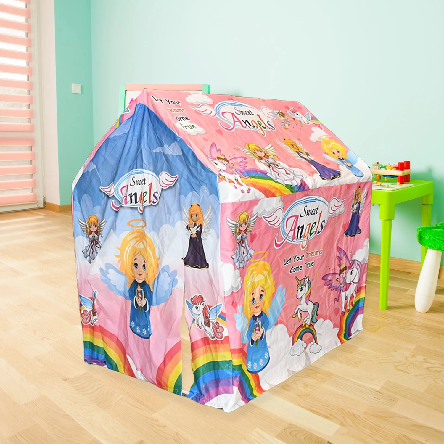 This tent house comes with a window in the front and a door- that can be rolled up with ease for crawl-in entry and exit. Its colorful design enables the interior to remain bright and well lit. Tent House is a product that is sure to light up your child's playtime and childhood.