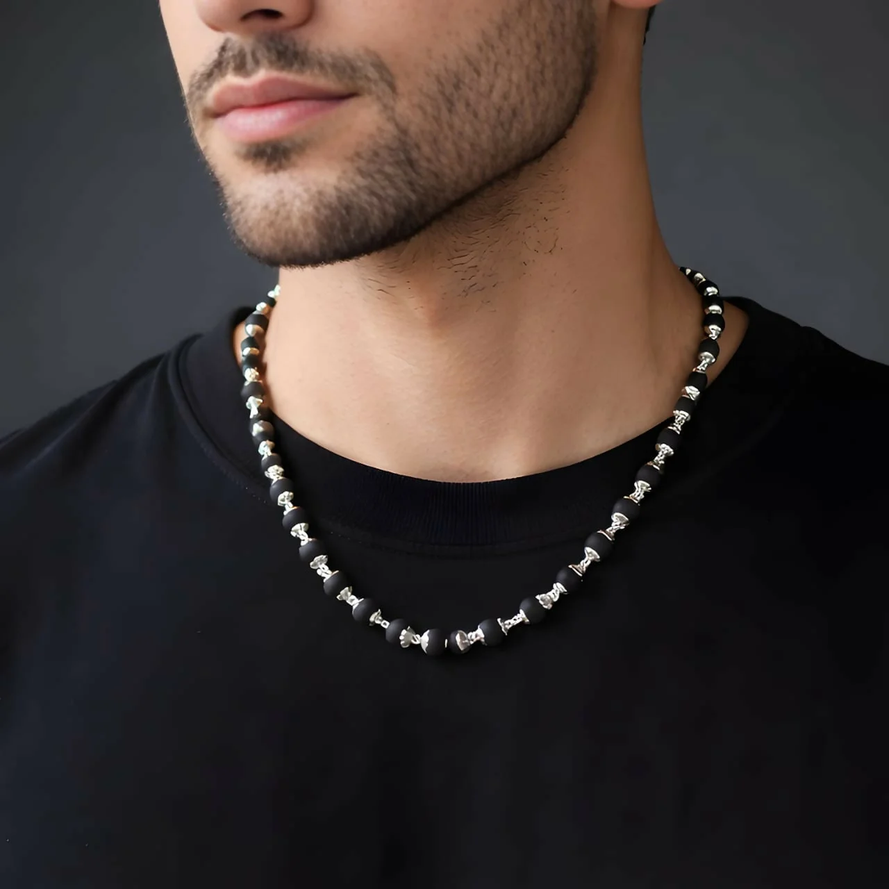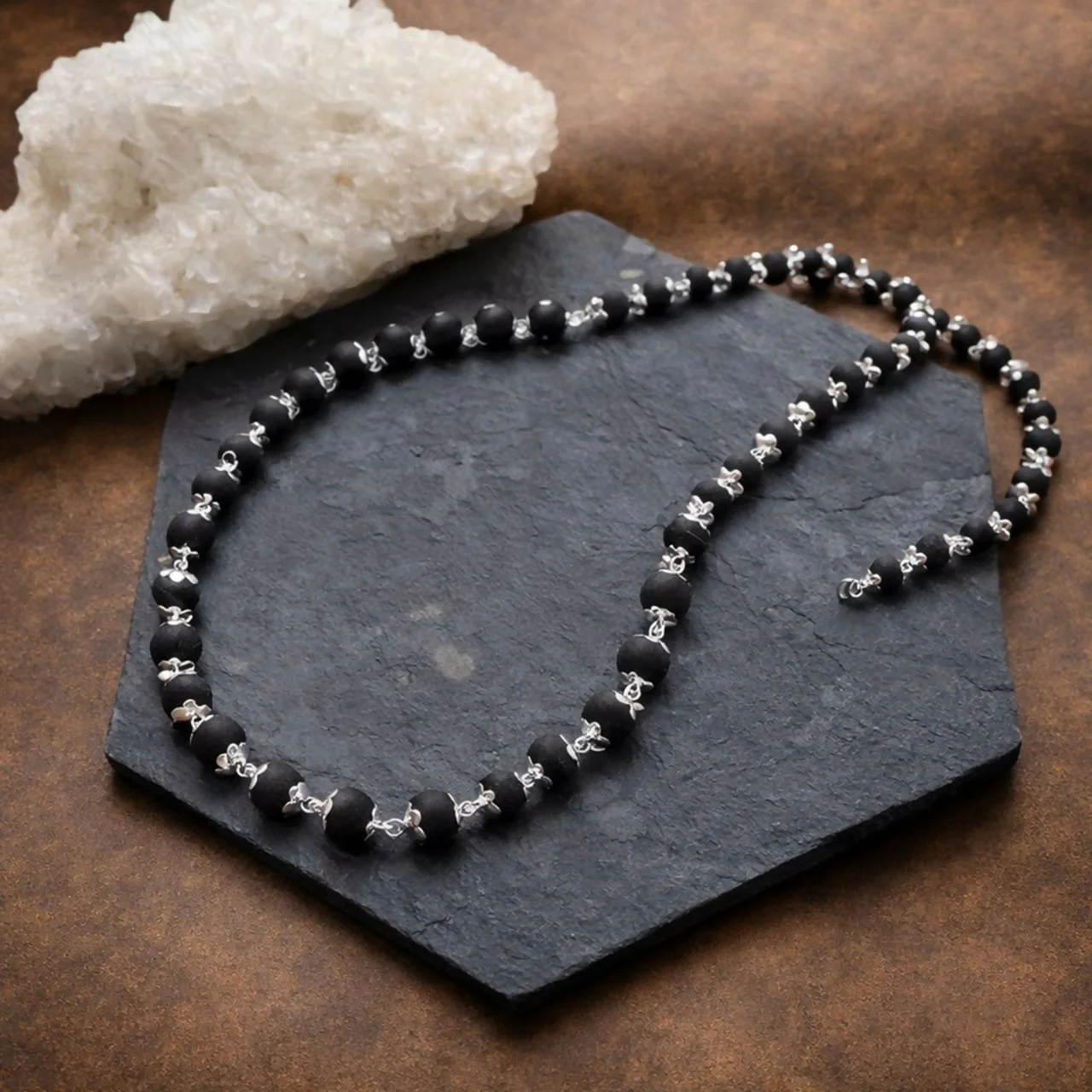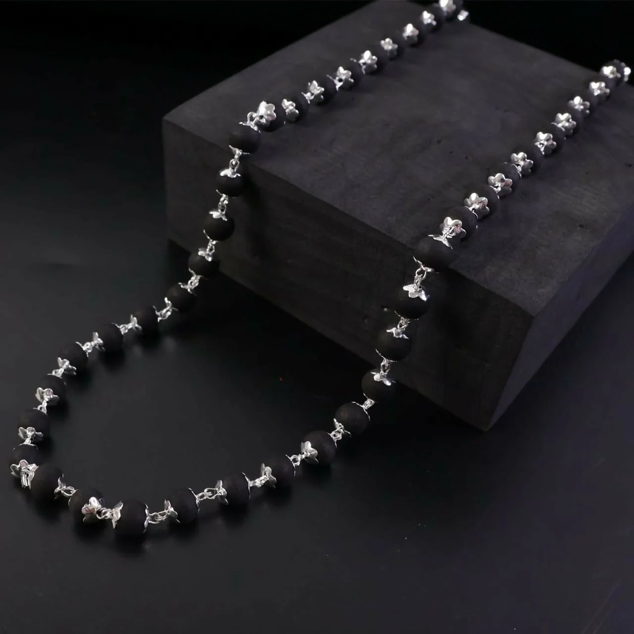 Elevate your jewelry collection with this beautifully crafted black matte beaded necklace featuring elegant silver floral link connectors. The contrast between the smooth black beads and the delicate silver accents creates a refined and sophisticated design suitable for both everyday wear and special occasions.Expertly assembled with attention to detail, this necklace offers a lightweight yet durable structure that ensures comfort and long-lasting quality. The floral silver links add a subtle decorative touch, giving the piece a unique and graceful character.