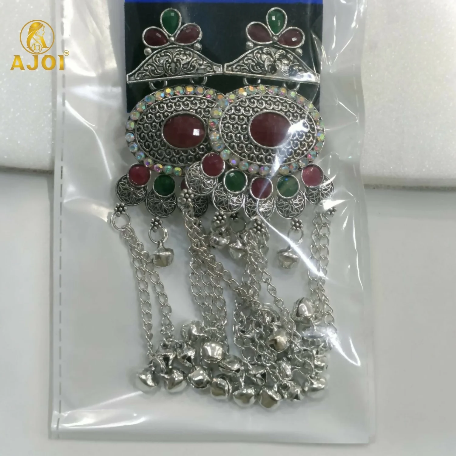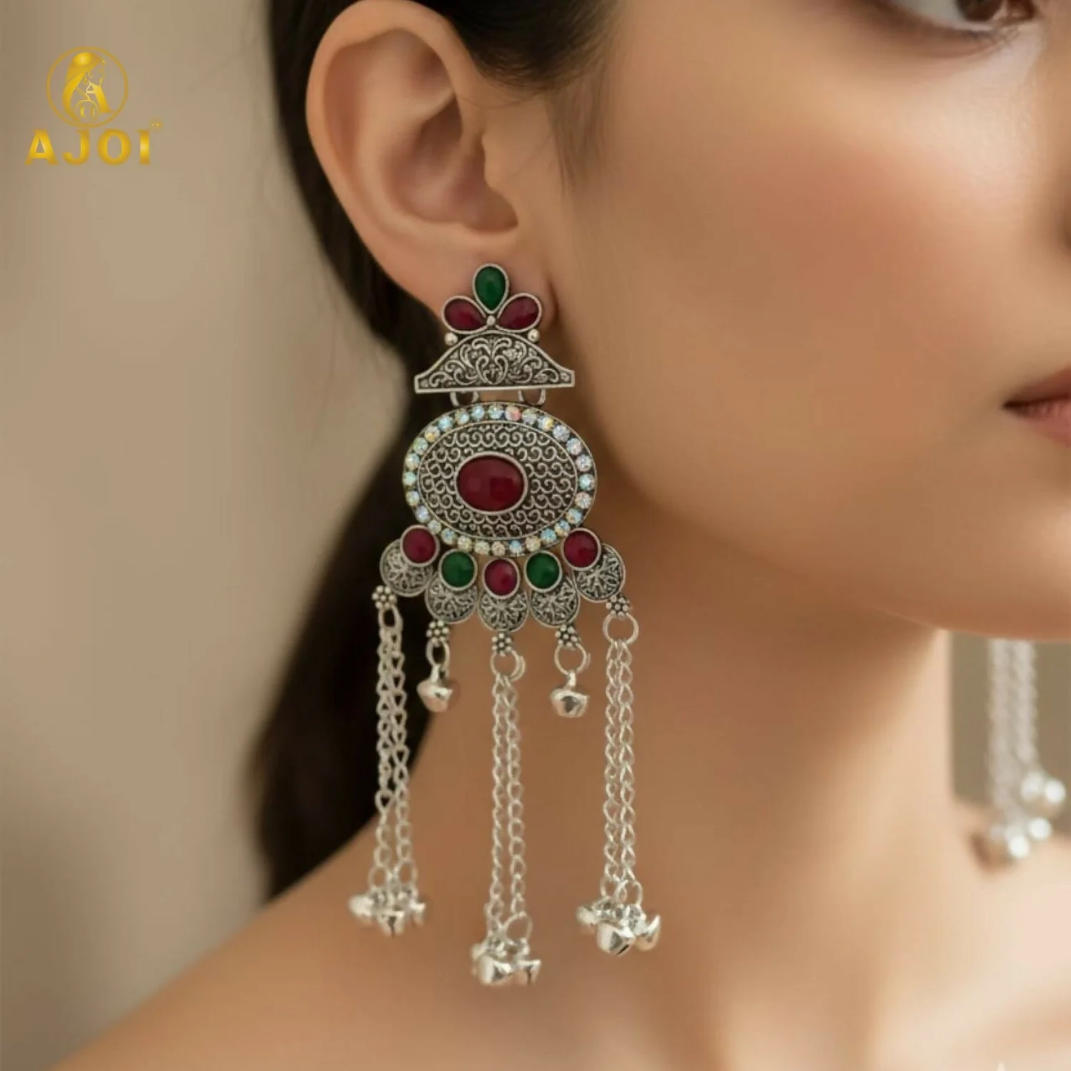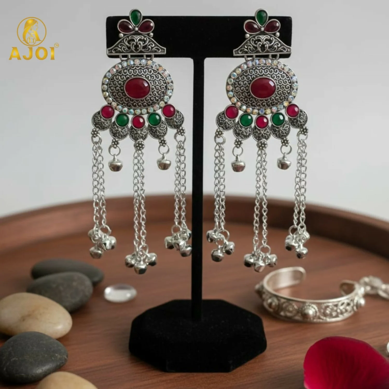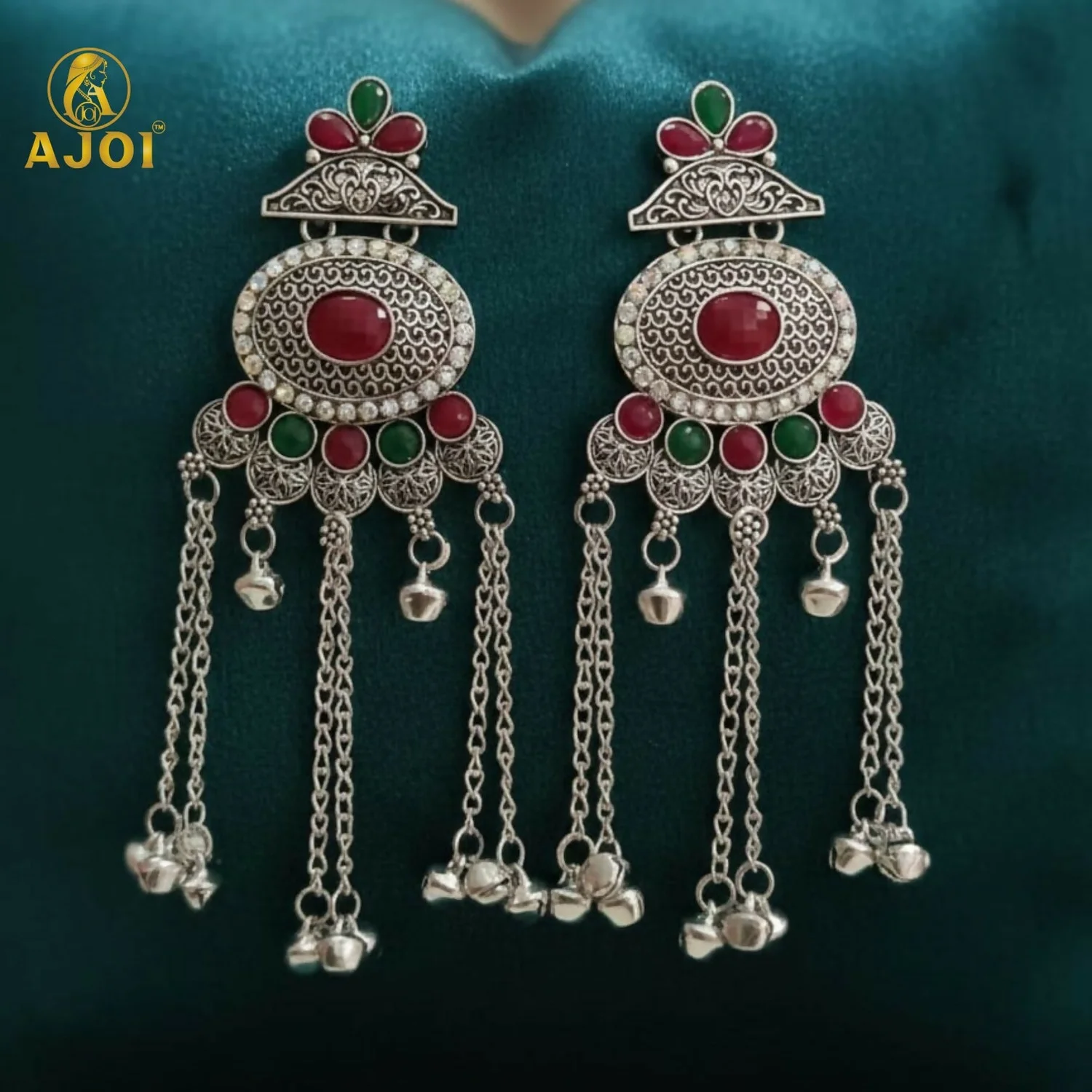 Upgrade your ethnic jewellery collection with these stunning traditional Kashmiri-style oxidised silver earrings. Featuring an intricate oval centerpiece adorned with bold red and green stone accents, this design beautifully blends antique craftsmanship with modern elegance. The earrings are enhanced with multiple dangling chains and delicate ghungroo latkan beads that create an eye-catching statement look.