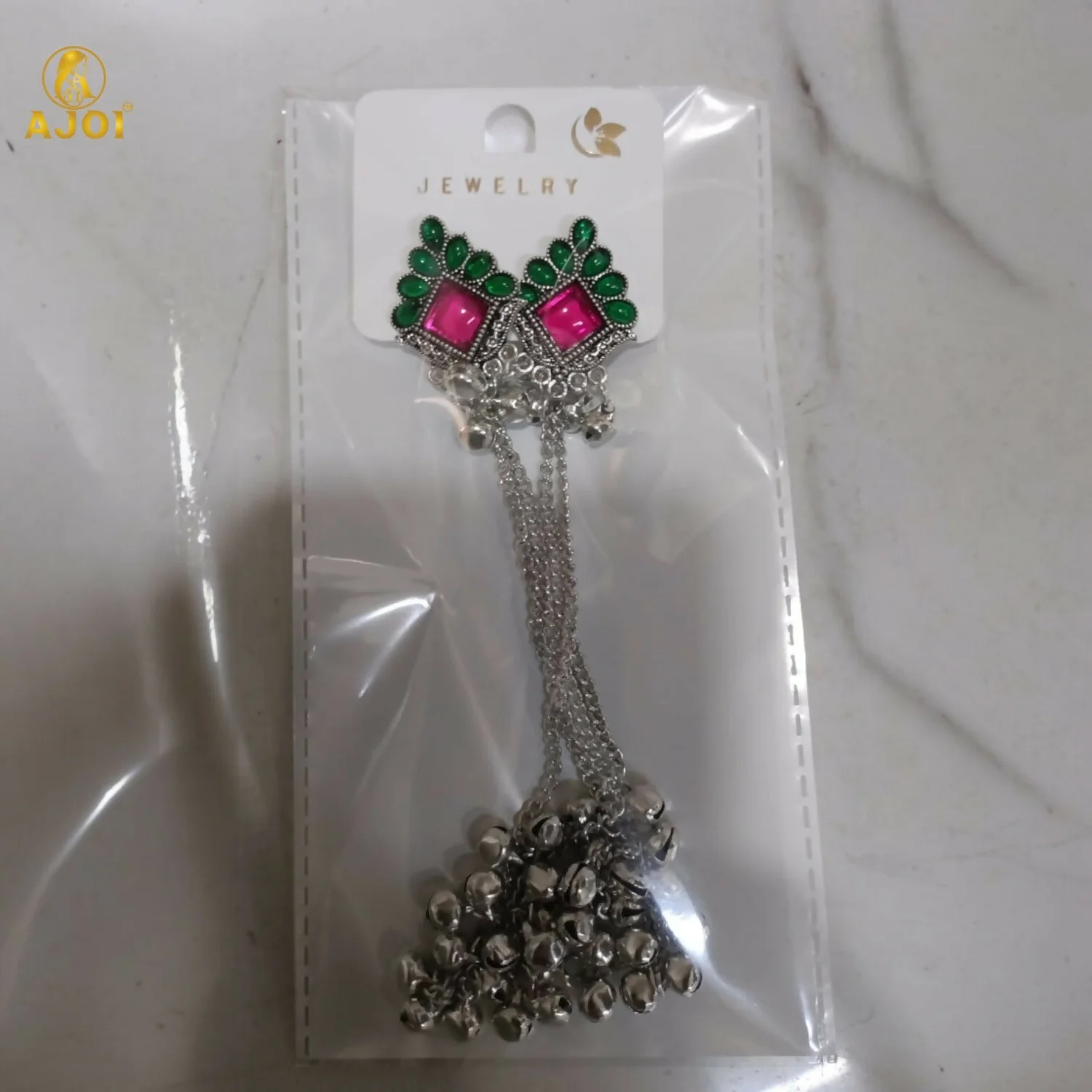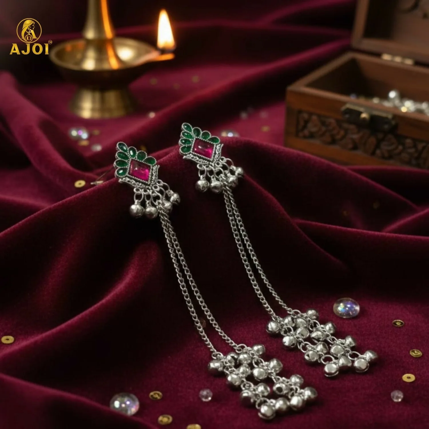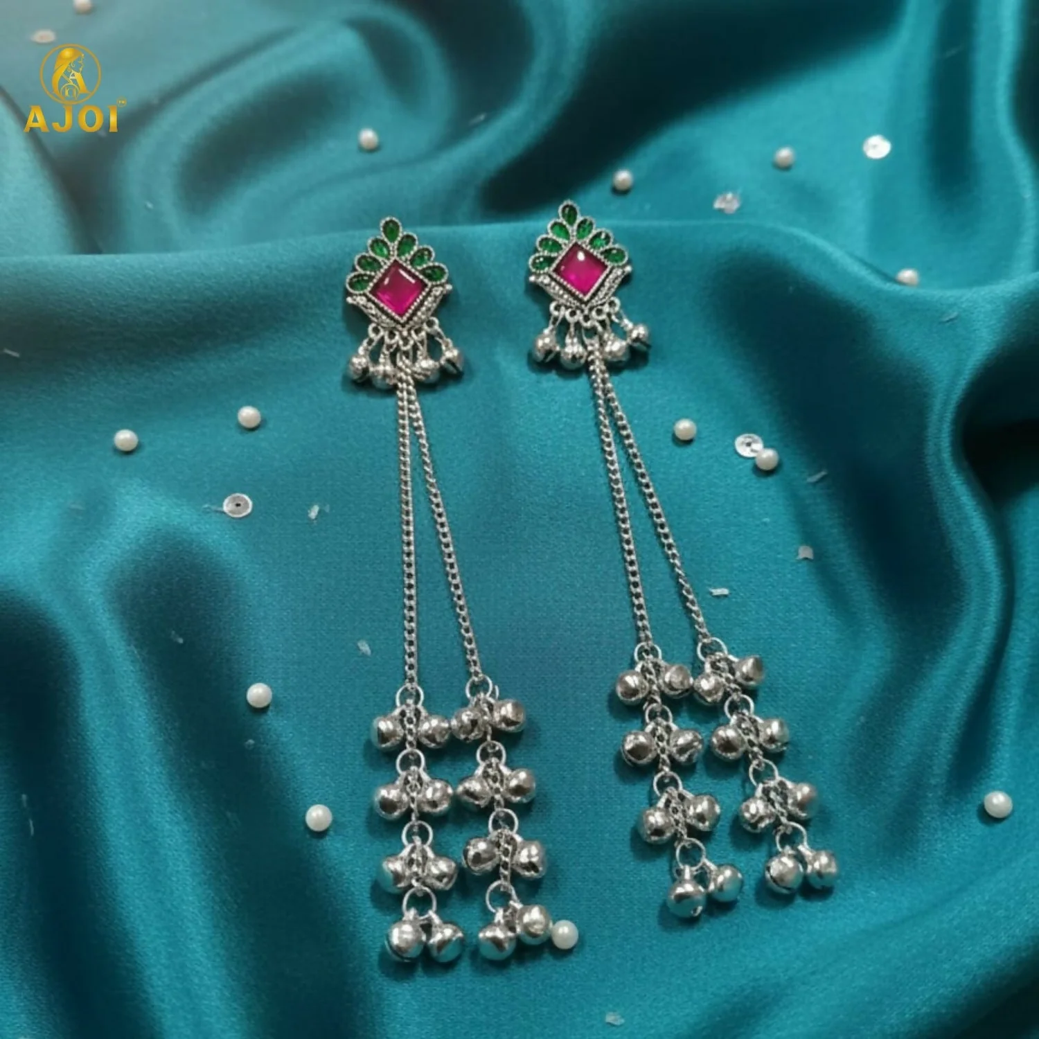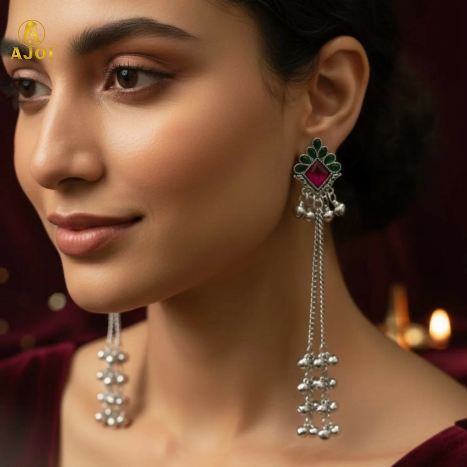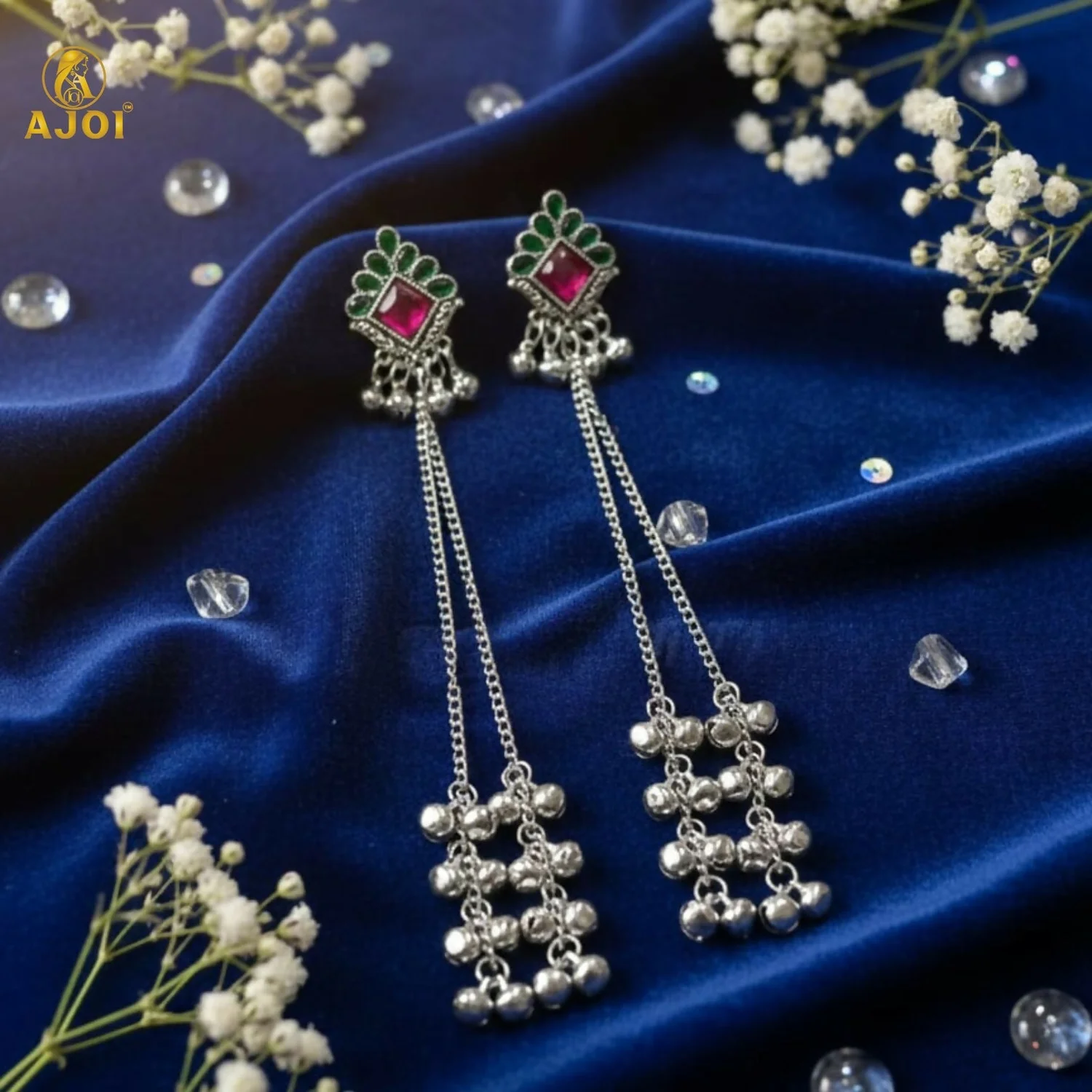 Be the first to review Kashmiri Style Silver Plated Long Chain Drop Earrings with Pink & Green Stones!