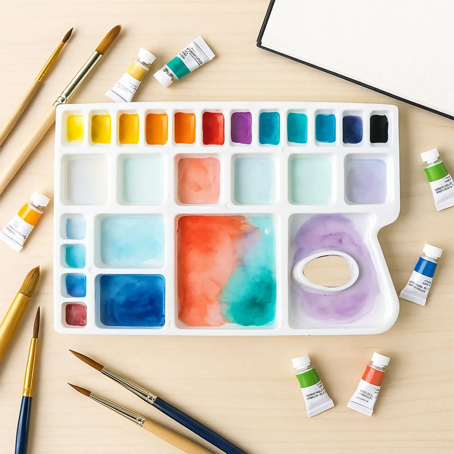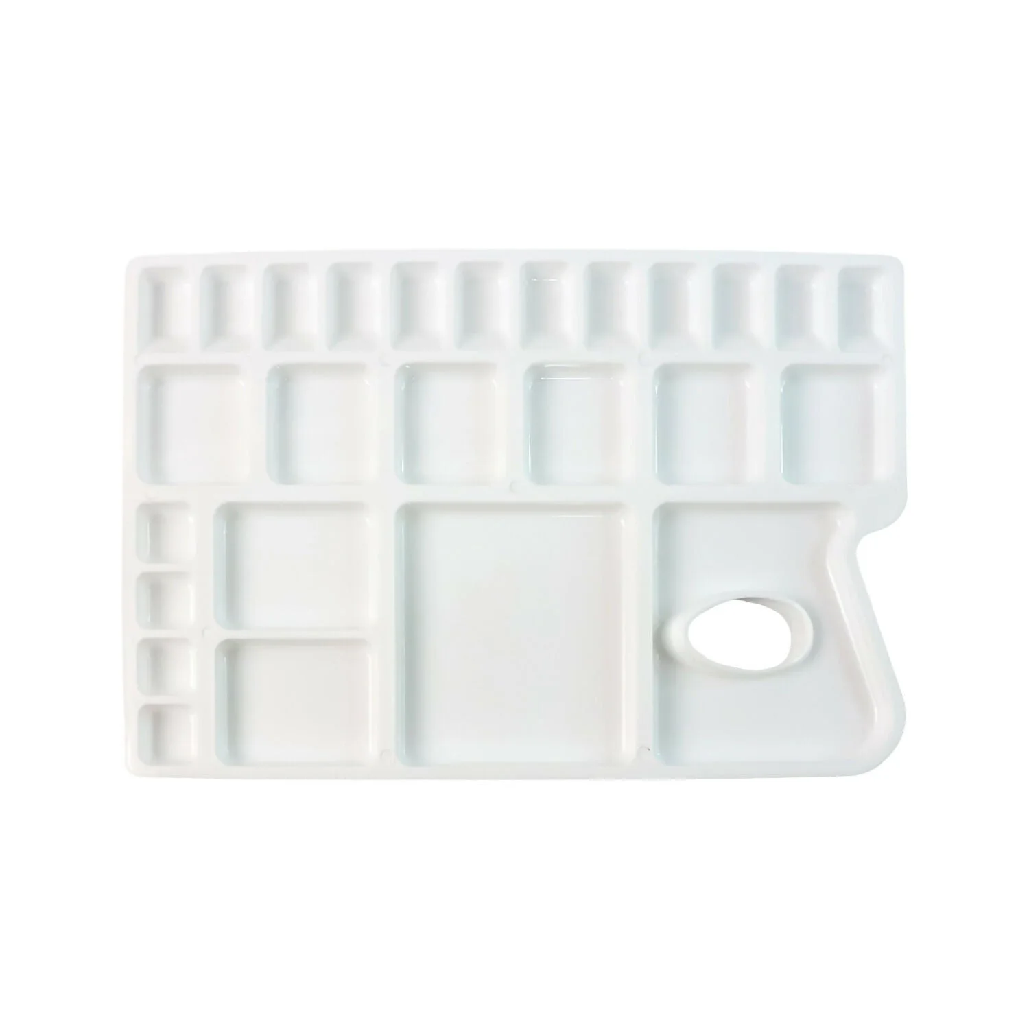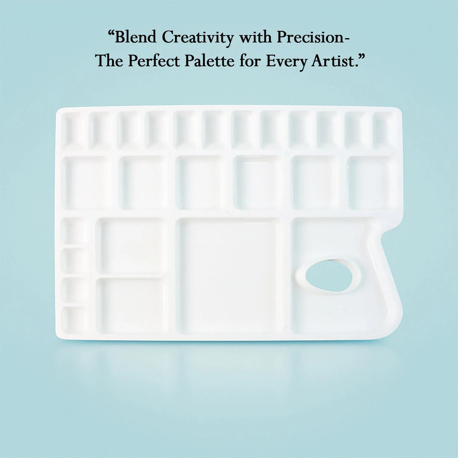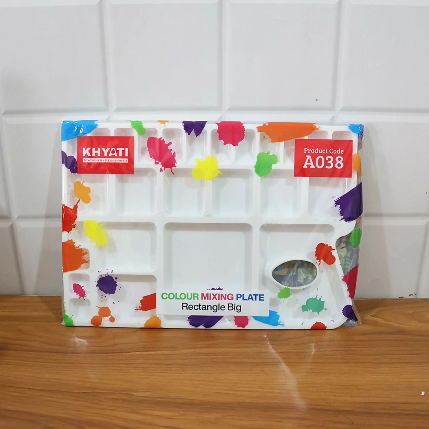 The Khyati Colour Mixing Plate – Rectangle Big is a premium-quality palette crafted for artists who value precision and organization in their work. Its spacious rectangular design features multiple deep and shallow wells, allowing for smooth colour blending and easy paint separation. The comfortable thumb hole ensures stability and control while painting, making it suitable for long creative sessions. Ideal for use with watercolours, acrylics, gouache, and poster colours, this palette’s durable and smooth surface ensures effortless cleaning and reuse. Perfect for students, professionals, and art enthusiasts.