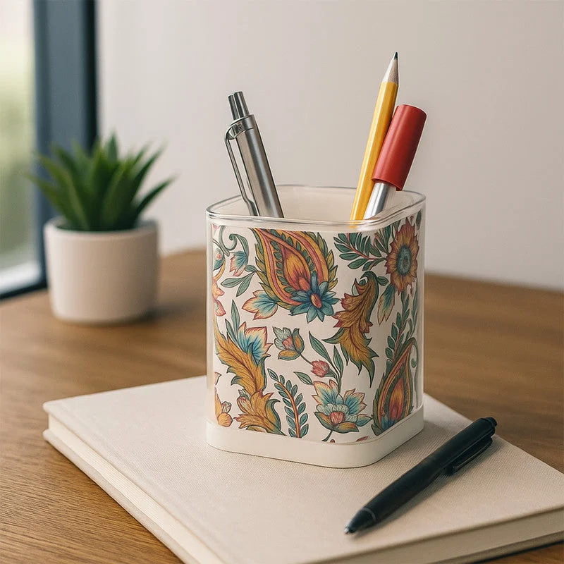 The Khyati Crystal Square Pen Stand is designed to bring sophistication and order to your workspace. Its square transparent body features an elegant floral printed insert that adds a refined touch to your desk decor. Compact yet spacious, it’s ideal for holding pens, pencils, scissors, and other office essentials neatly in one place. Crafted from high-quality transparent plastic, this pen stand offers durability, stability, and a stylish modern look that complements any setting—be it home, office, or classroom.