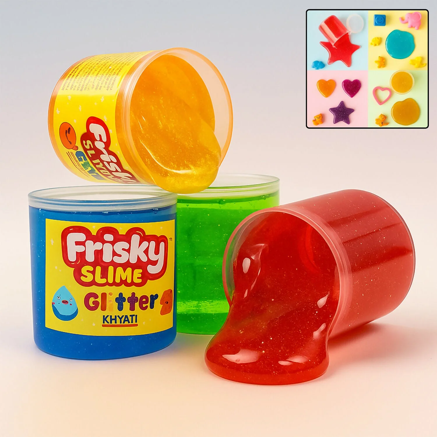 Khyati Frisky Glitter Slime brings sparkle and excitement to playtime with its shiny, stretchable texture. It helps kids enhance creativity, color recognition, and hand-eye coordination through fun sensory play. Safe, non-sticky, and smooth to touch — perfect for stress relief and craft activities. Images shown are for reference only; product comes as a single piece and color may vary.