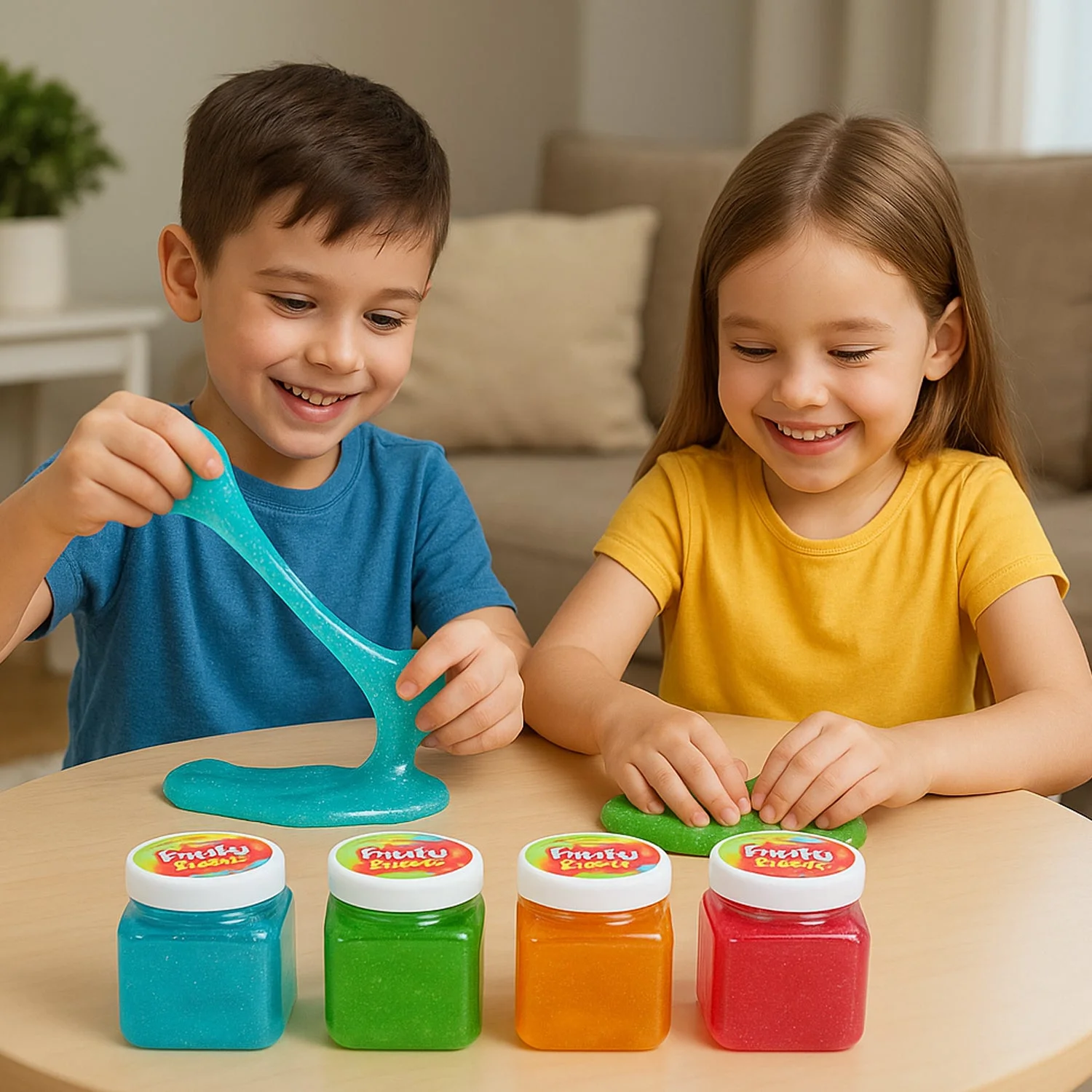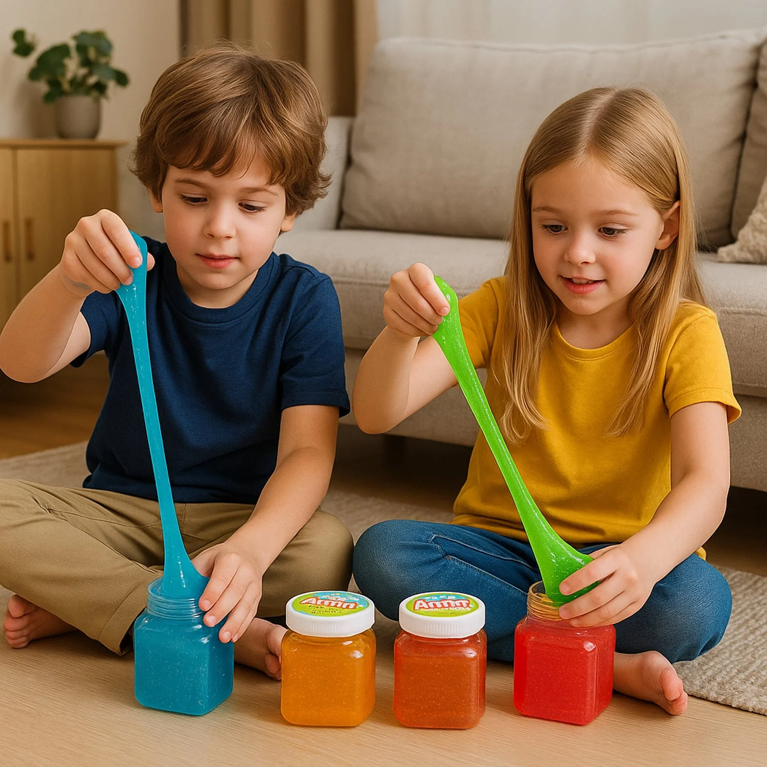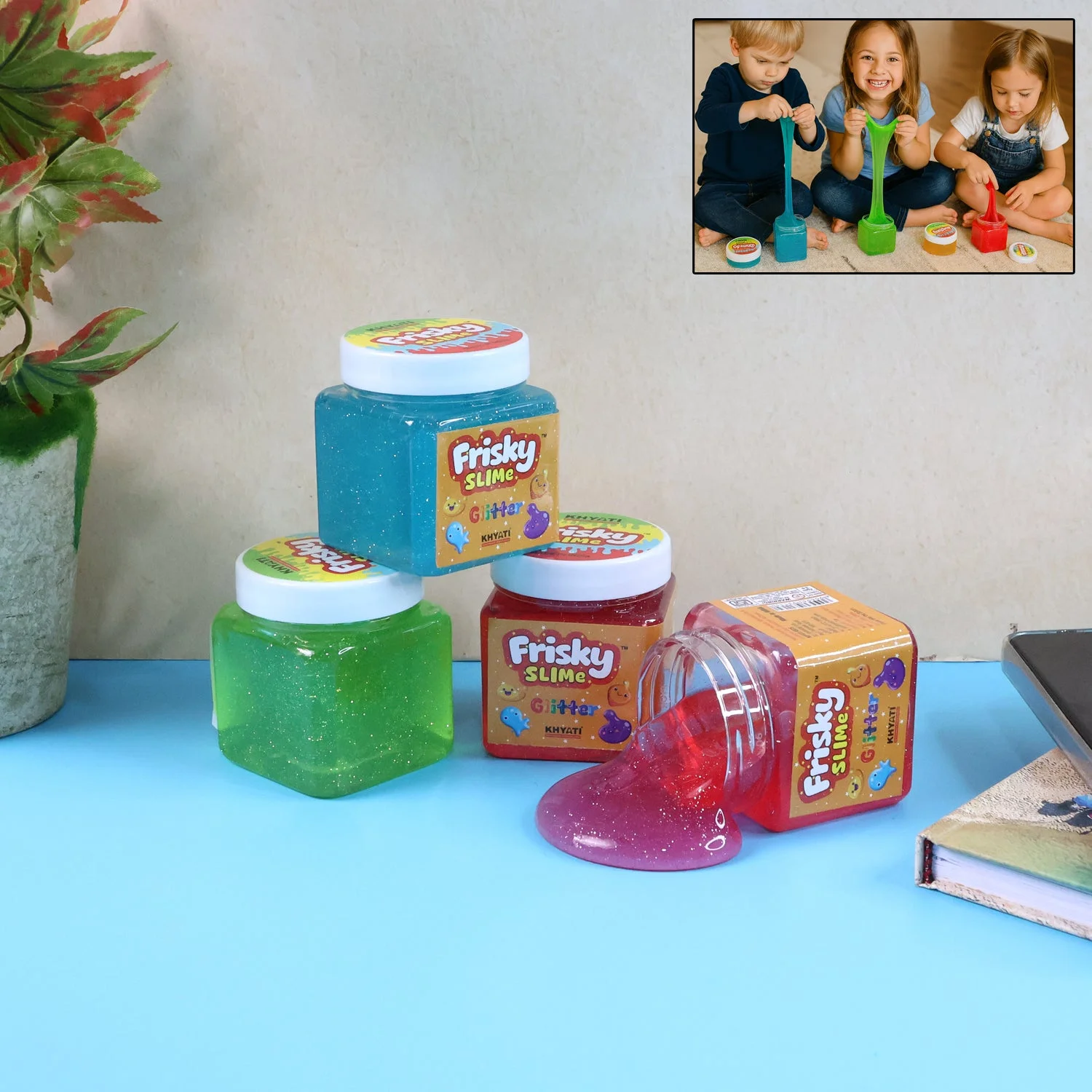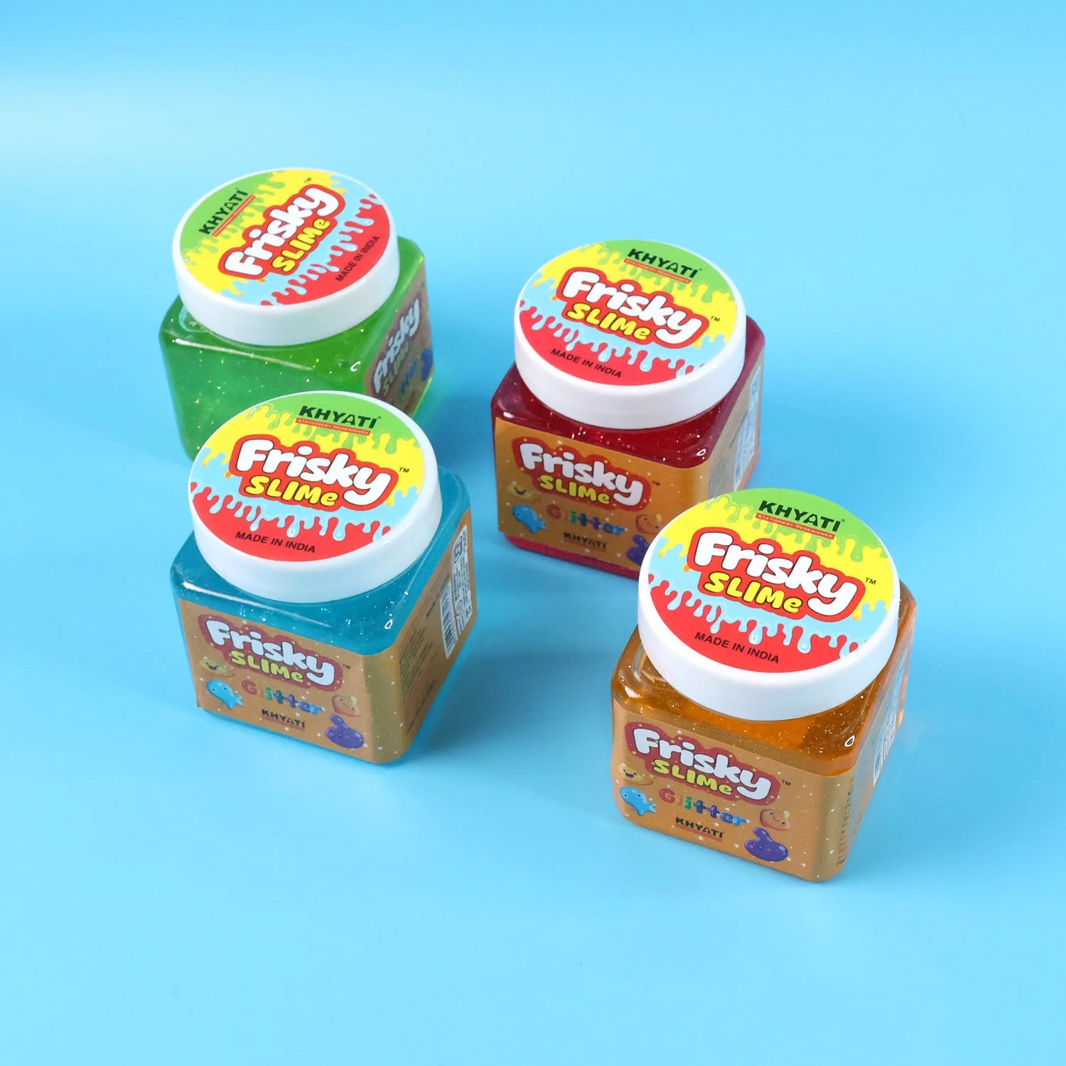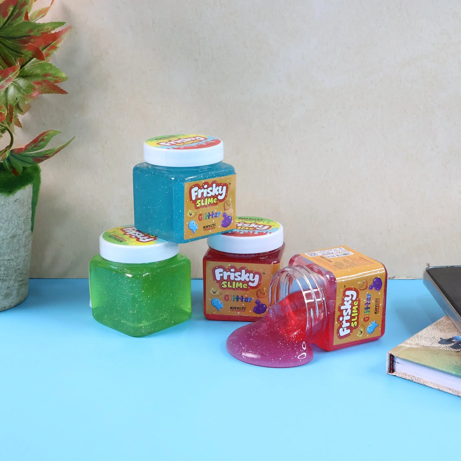 Add sparkle to playtime with the Khyati Frisky Slime Glitter Edition! Packed in a square jar, this shiny and stretchy slime is infused with glitter, making it extra fun for kids to play, stretch, and squish. Safe, soft, and non-toxic, it’s designed to provide hours of sensory entertainment while improving creativity and motor skills. The glitter finish makes it extra exciting, and the reusable jar keeps the slime fresh for repeat play.Images shown are for reference only; product comes as a single piece and color may vary.