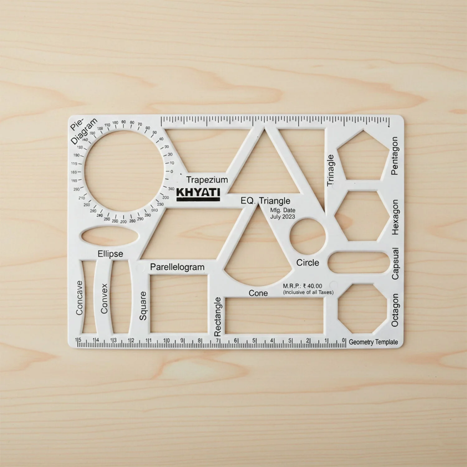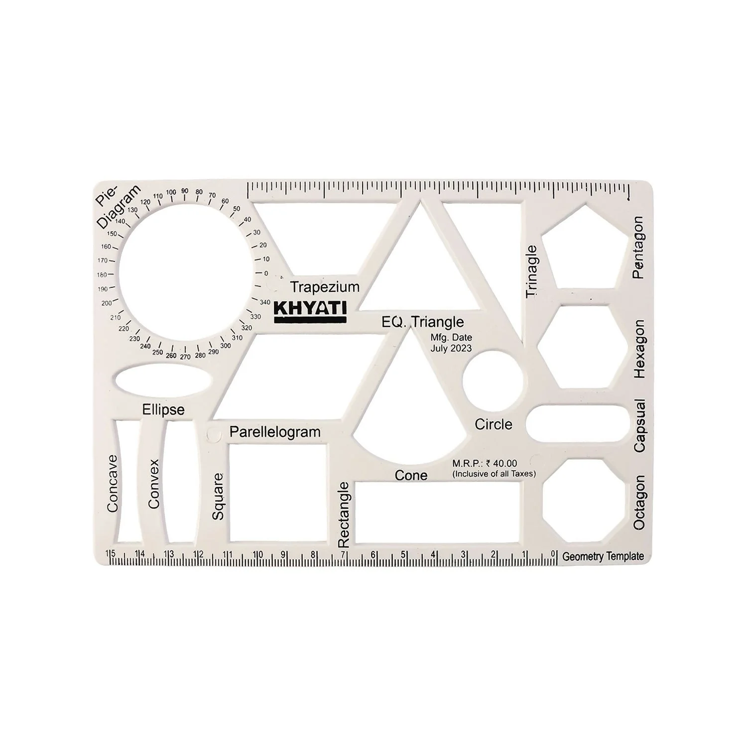 The Khyati geometry template set comes with 10 pieces of multipurpose geometry stencils designed to help students draw accurate geometric shapes with ease. Each template includes 16 commonly used shapes, making it an essential stationery tool for mathematics, geometry practice, and technical drawing. The clearly marked shapes and measurement guides ensure neat and precise diagrams for everyday schoolwork.