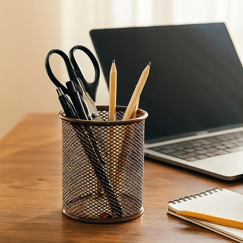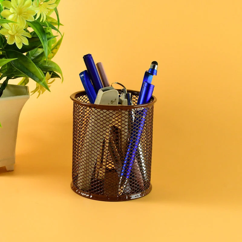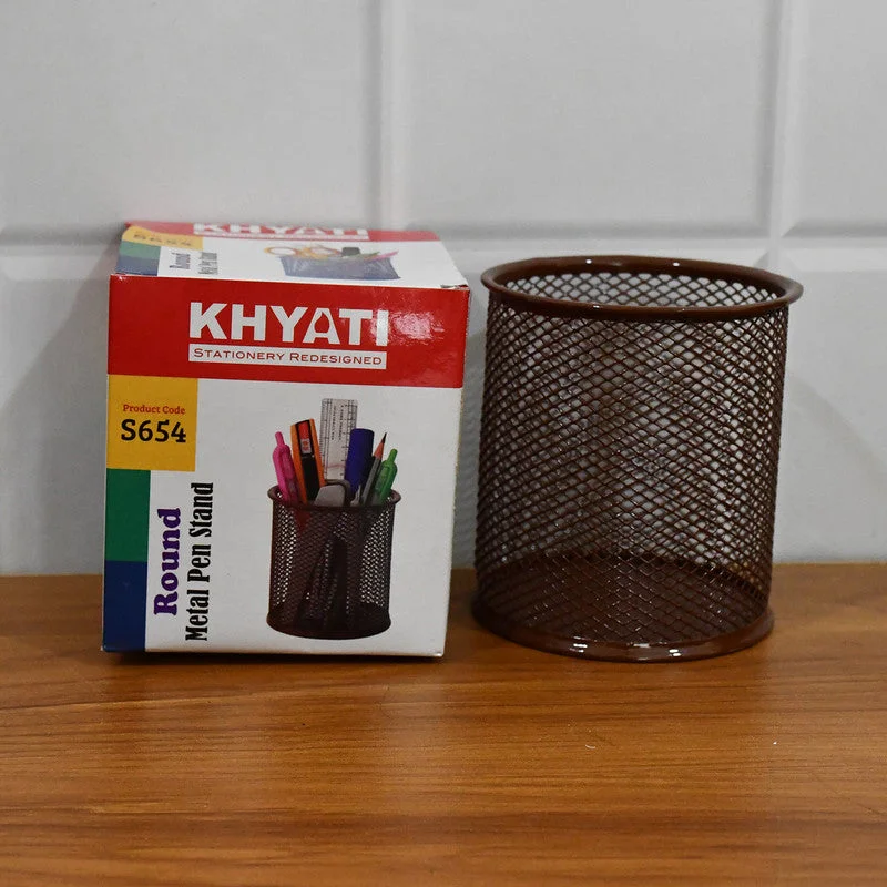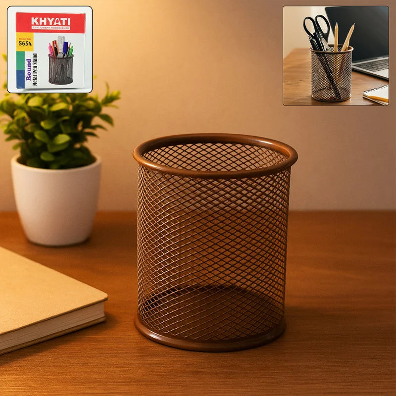 Keep your workspace clean and stylish with the Khyati Round Metal Pen Stand. Crafted from sturdy metal mesh, this pen holder combines strength with modern design, allowing you to easily organize pens, pencils, markers, scissors, and other stationery items. Its ventilated mesh structure ensures visibility and easy access while preventing dust build-up. The smooth edges and solid base provide excellent stability, making it perfect for office desks, classrooms, and home study areas. This pen stand enhances both functionality and aesthetics, helping maintain an organized and professional workspace.