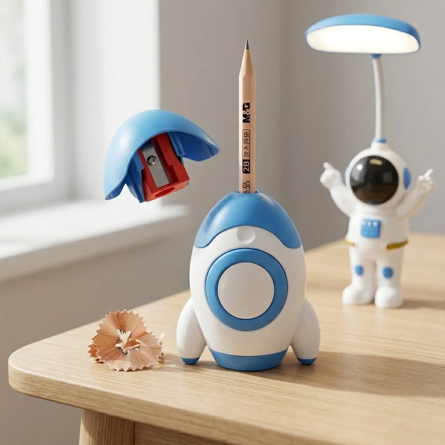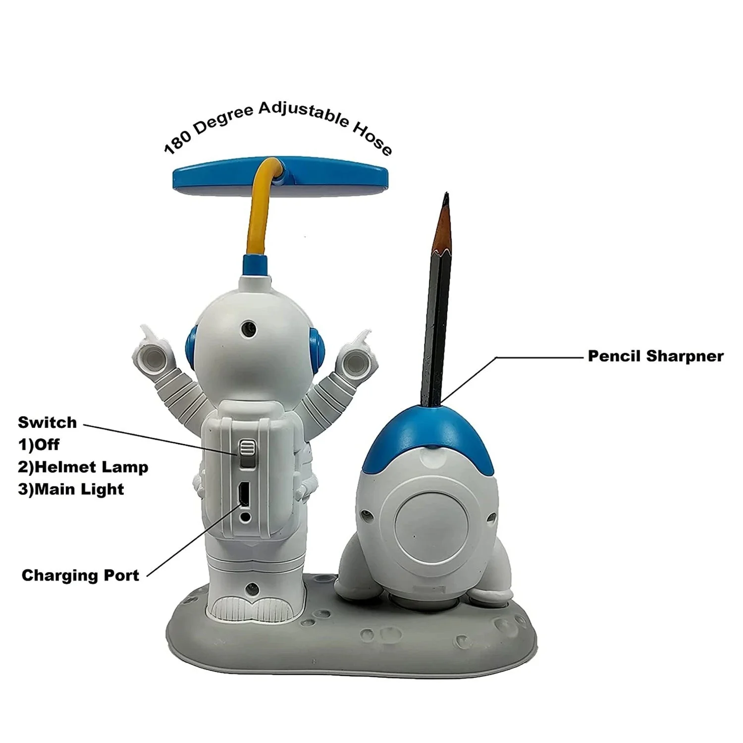 Make study time fun with this kids study lamp featuring a creative astronaut design. This LED table lamp provides bright and energy-efficient lighting for reading and studying.It also includes a built-in sharpener, making it a study table lamp for kids that combines fun and functionality. Perfect as a kids desk lamp, it enhances focus and creativity.