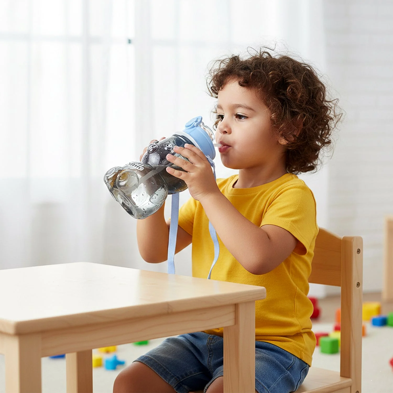 Equipped with a comfortable shoulder strap, this bottle is easy for kids to carry to school, playgrounds, picnics, or travel outings. The transparent body allows parents to easily check the water level, while the smooth edges and child-friendly design ensure safe handling. A perfect everyday hydration companion for kids that combines functionality, safety, and cute design.
