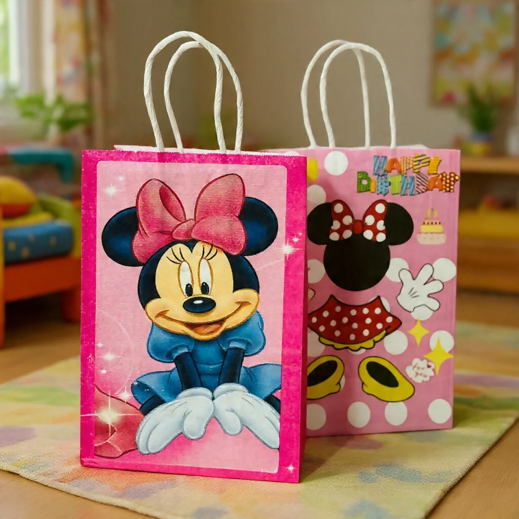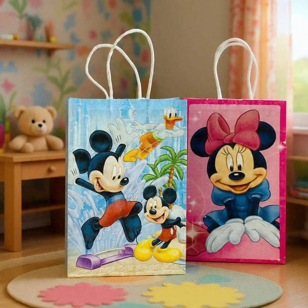 Add fun and color to birthday celebrations with these cartoon theme gift paper bags. This pack of 4 vibrant paper bags is perfect for kids' birthday parties, return gifts, party favors, and small presents. Made from sturdy paper with strong rope handles, the bags are easy to carry and durable for holding candies, chocolates, toys, and small gifts. The bright cartoon prints make them attractive for kids and ideal for party decorations and gifting.