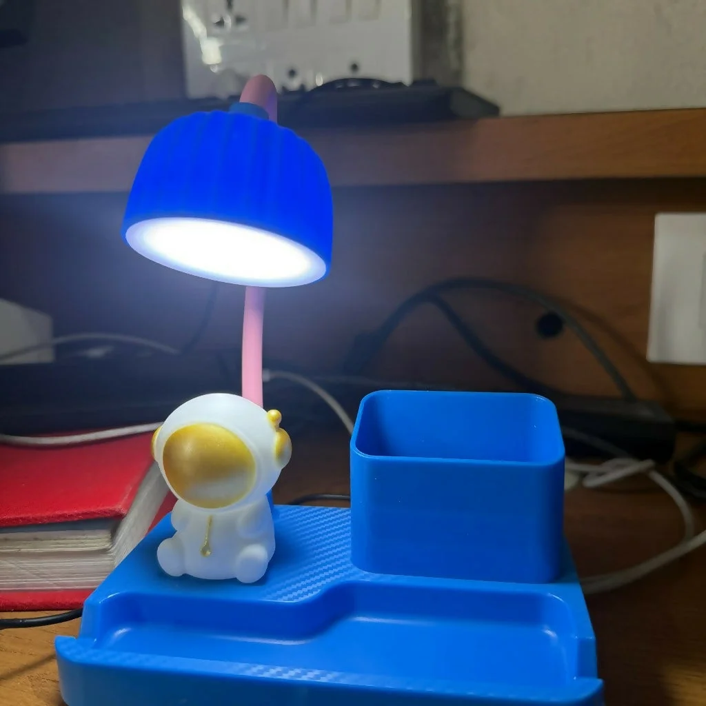 Make study time fun and organized with this multi-functional kids desk lamp. Designed with a cute astronaut theme, this lamp features a soft LED light ideal for reading, studying, or night use. It comes with a built-in sharpener, a pen holder compartment, and a convenient phone holder, helping keep your desk neat and efficient. The flexible neck allows you to adjust the light angle easily, making it perfect for kids, students, and home desks. A great combination of utility and playful design for everyday use.