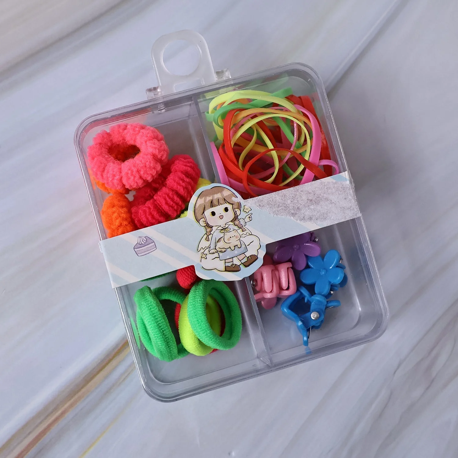 Kids Hair Accessories Set – Mix Design Pack with Hair Bands, Rubber Bands & Cute Hair Clips in Storage Box (1 Set)