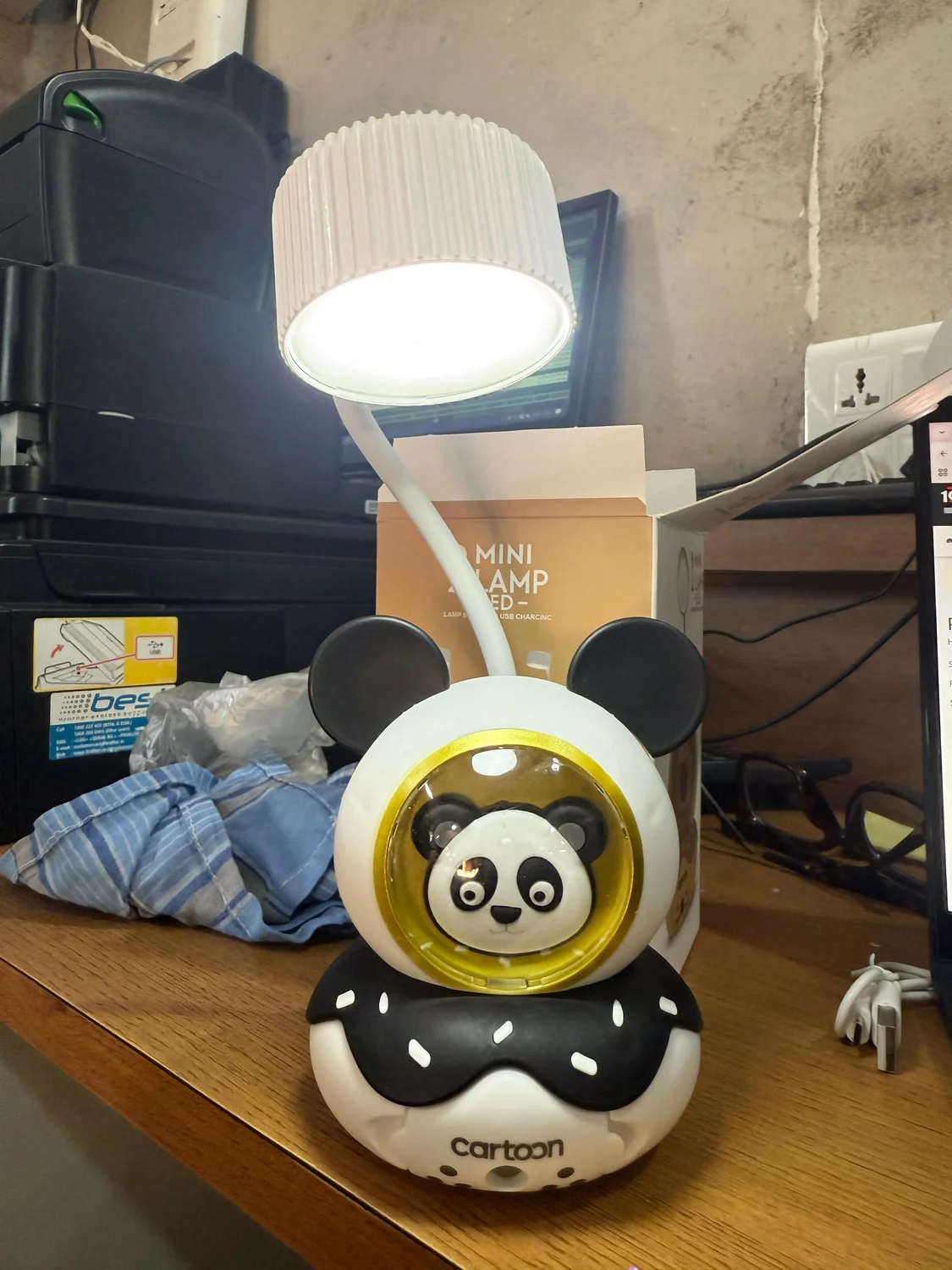 Make study time fun and organized with this adorable panda desk lamp featuring a built-in pencil sharpener. Designed with a cute panda cartoon style, this multifunction desk accessory combines a soft LED study lamp and pencil sharpener in one compact design. The flexible lamp neck allows easy adjustment to direct light for reading, writing, or homework. Perfect for kids' study tables, bedrooms, and classrooms, this lamp keeps pencils sharp while providing comfortable lighting for everyday study.