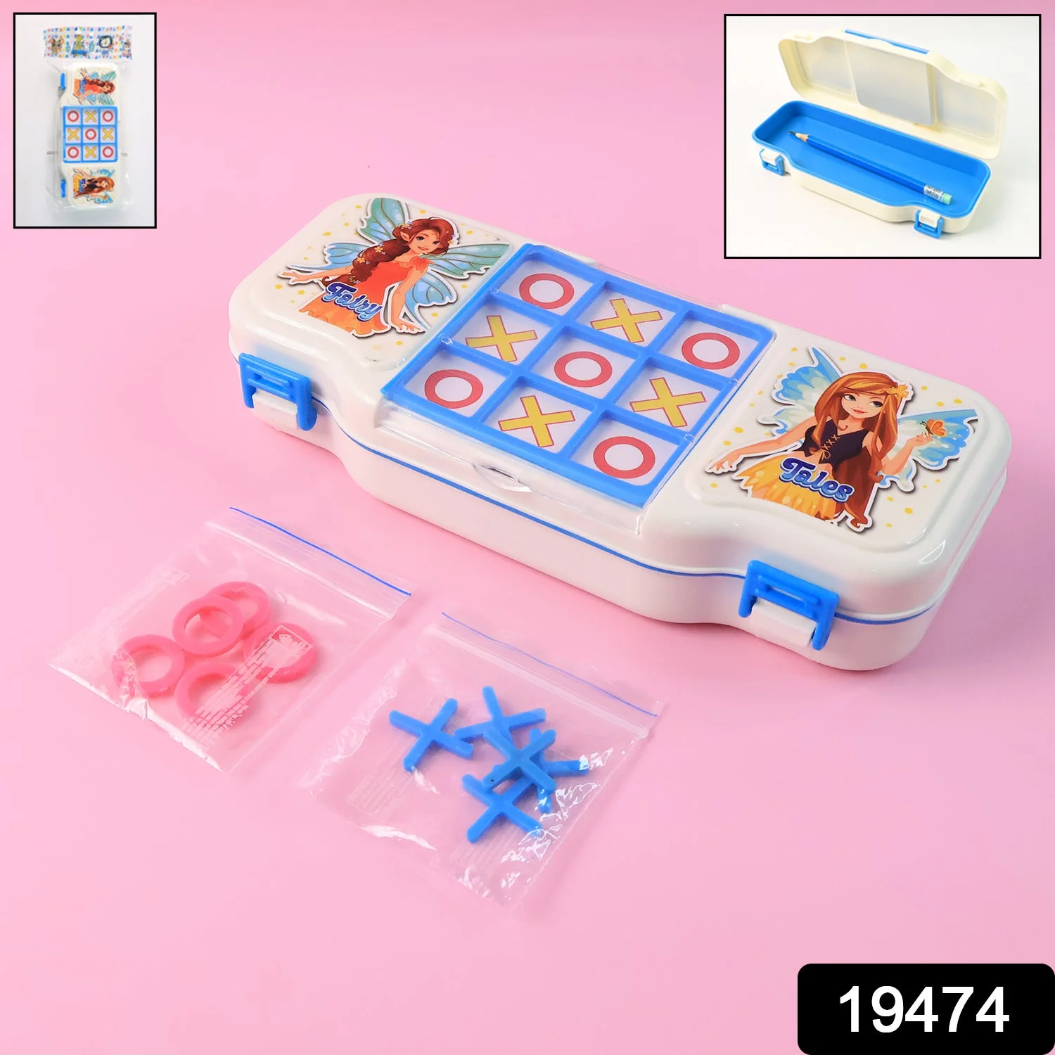 Kids Pencil Box with Built-in Tic Tac Toe Game | Multipurpose Stationery Storage Case with Puzzle Play Lid, Lock Clips & Cartoon Fairy Print | Fun & Functional Pencil Organizer for School Boys and Girls – 1 Pc