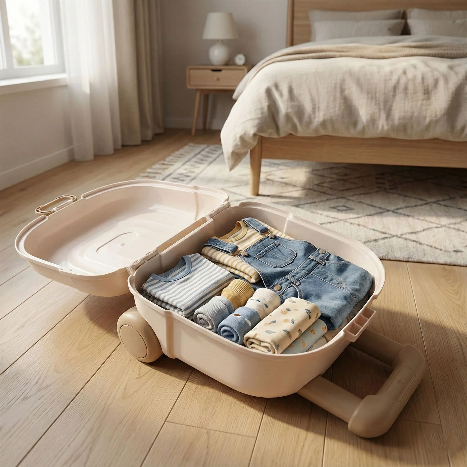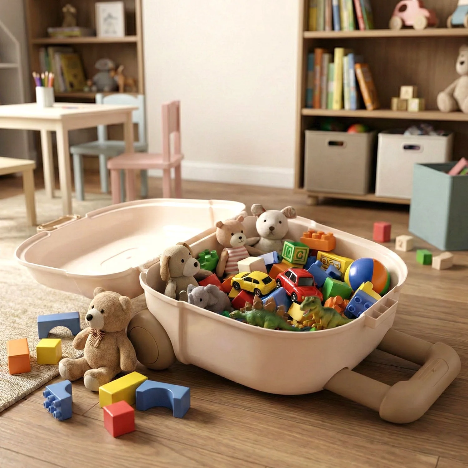 This kids portable toy storage case is designed to keep toys neatly organized while adding convenience and portability to everyday play. Styled like a compact travel case with a sturdy top handle, it allows children and parents to easily carry toys from one room to another. The smooth, rounded design makes it safe for kids, while the spacious interior can hold small toys, building blocks, figurines, and accessories. Ideal for bedrooms, playrooms, and living spaces, this storage box helps reduce clutter and encourages kids to develop good organization habits.