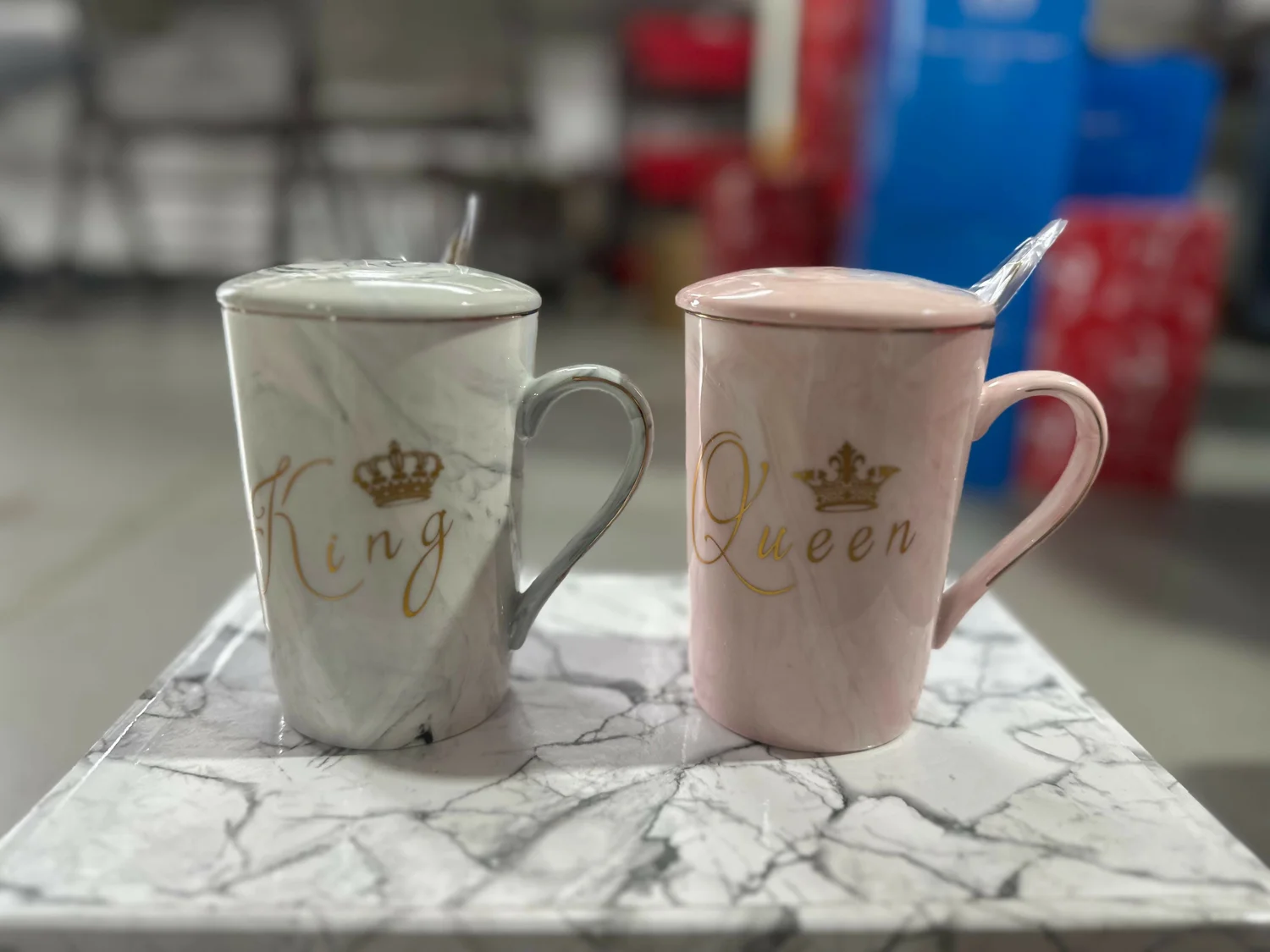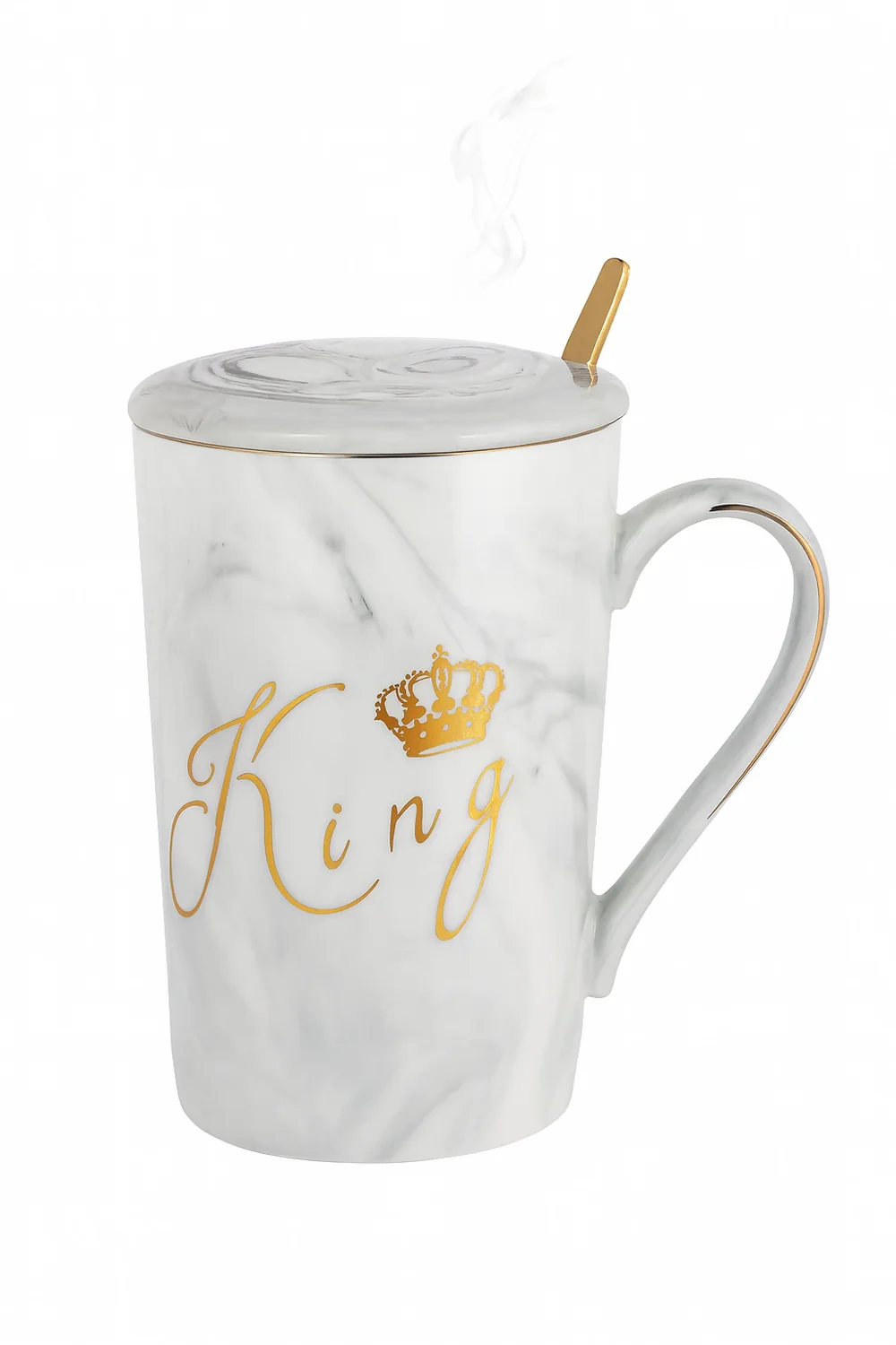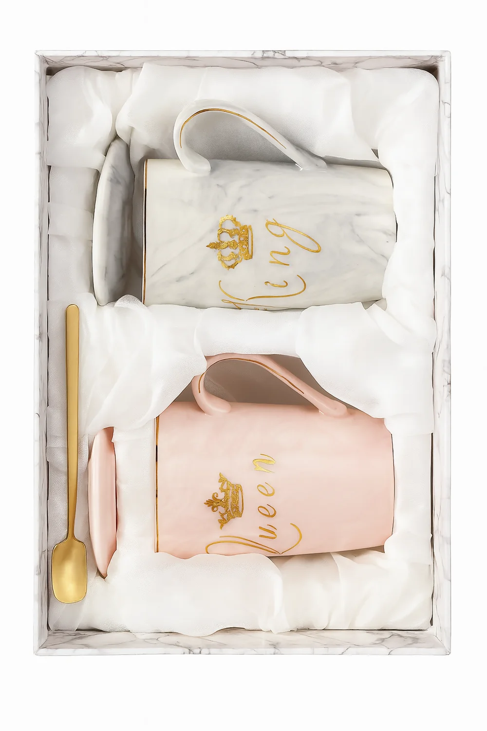 ✅ Elegant King & Queen Design – Marble ceramic mugs with golden crown and lettering.