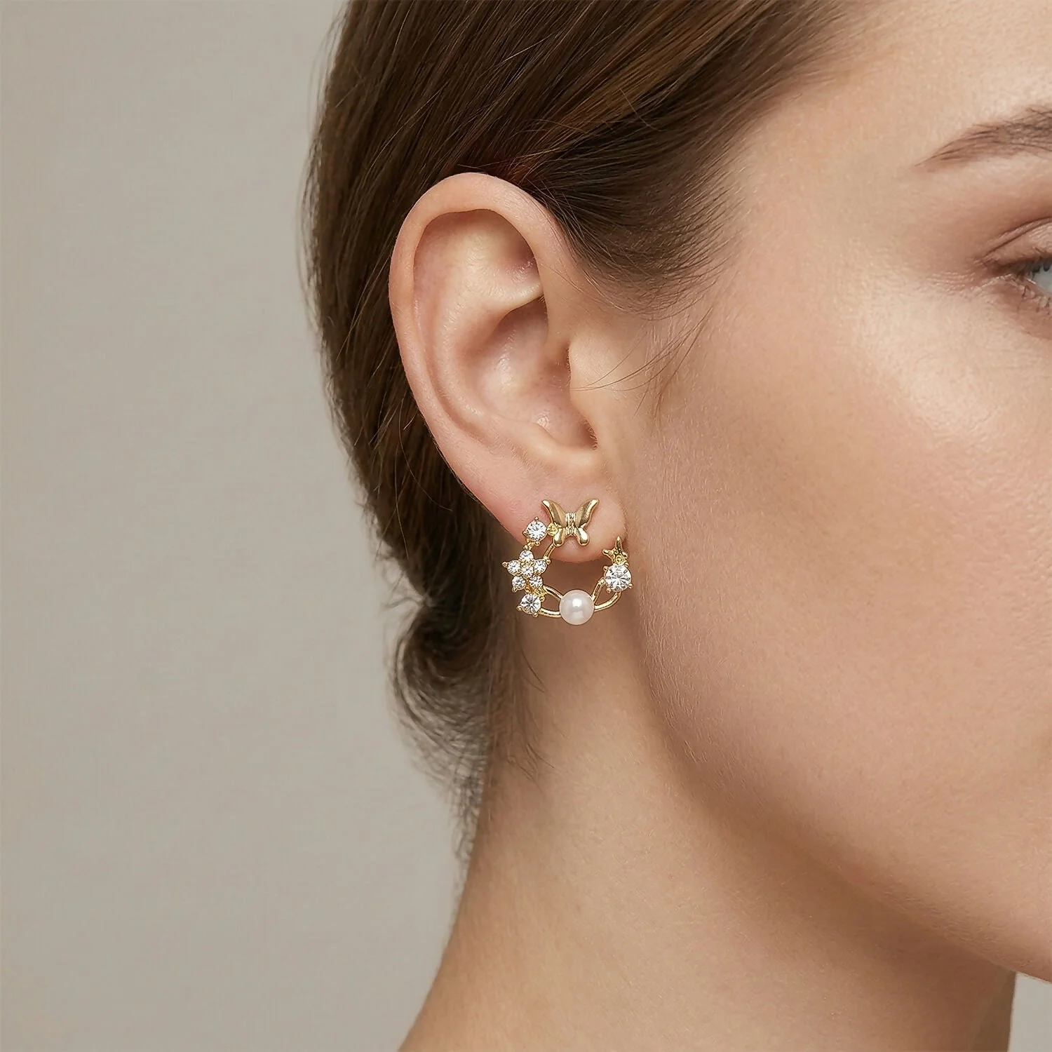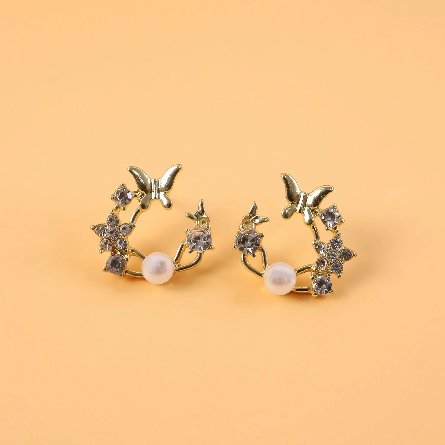 Design: These intricate studs feature a dainty golden butterfly and shimmering crystal flowers arranged in a graceful semi-wreath. A single, high-luster pearl sits at the center, completing this whimsical and feminine design.