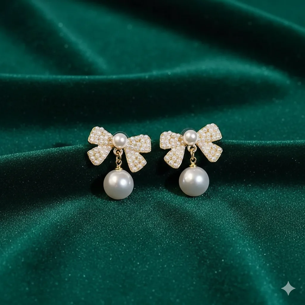 Design: These earrings feature a wide, textured ribbon bow completely encrusted with shimmering micro-crystals for maximum brilliance. A single, large, high-luster pearl hangs gracefully below, creating a beautiful contrast between the sparkle and the smooth pearl finish.