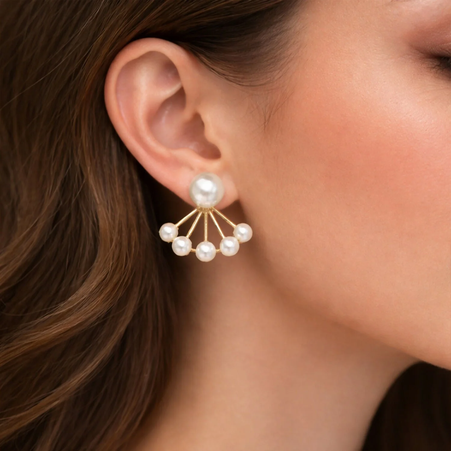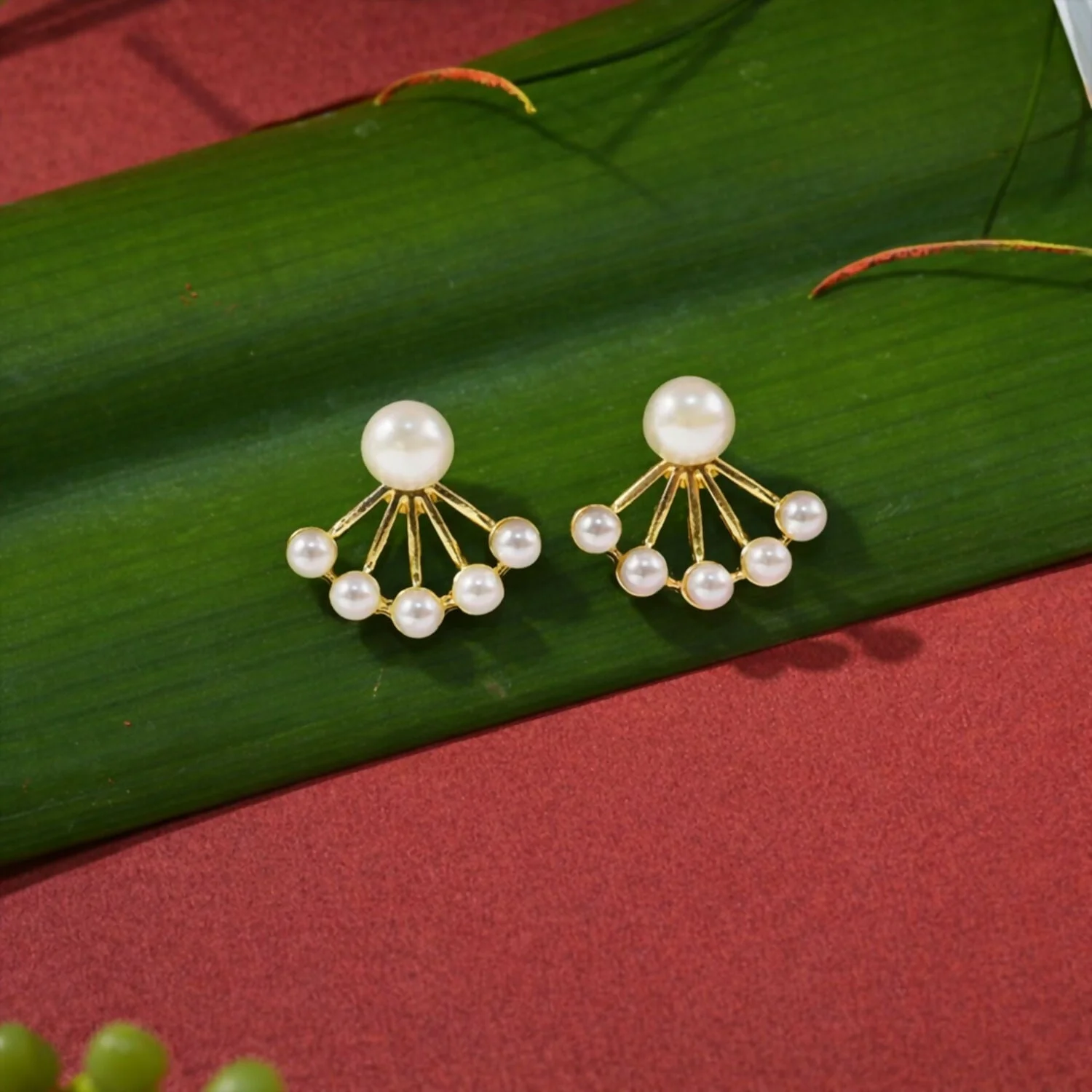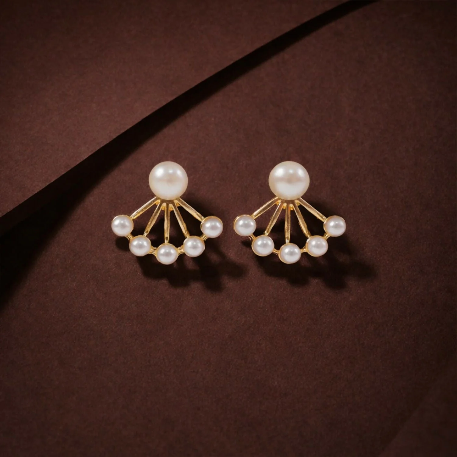 These elegant pearl stud earrings feature a unique fan-shaped design that looks graceful and stylish. The top is finished with a classic round pearl, while the lower part is beautifully arranged with small pearl beads in a semi-circle pattern, giving a royal and classy appearance. The golden framework adds a premium touch and makes the earrings stand out without looking heavy. Perfect for daily wear, office wear, festive functions, and party looks, these earrings match both traditional and western outfits. A lovely choice for gifting, they add a soft, feminine charm to any jewellery collection.