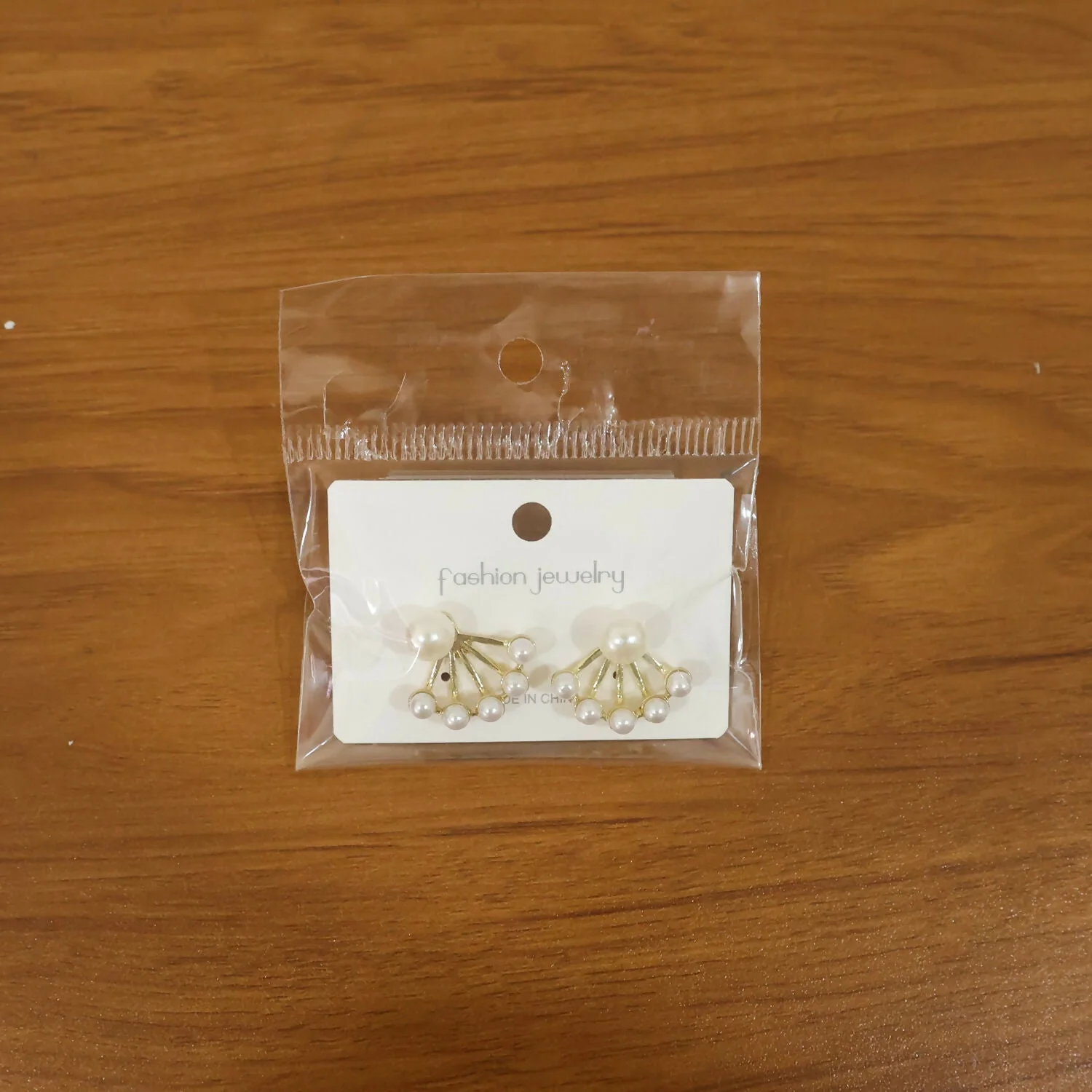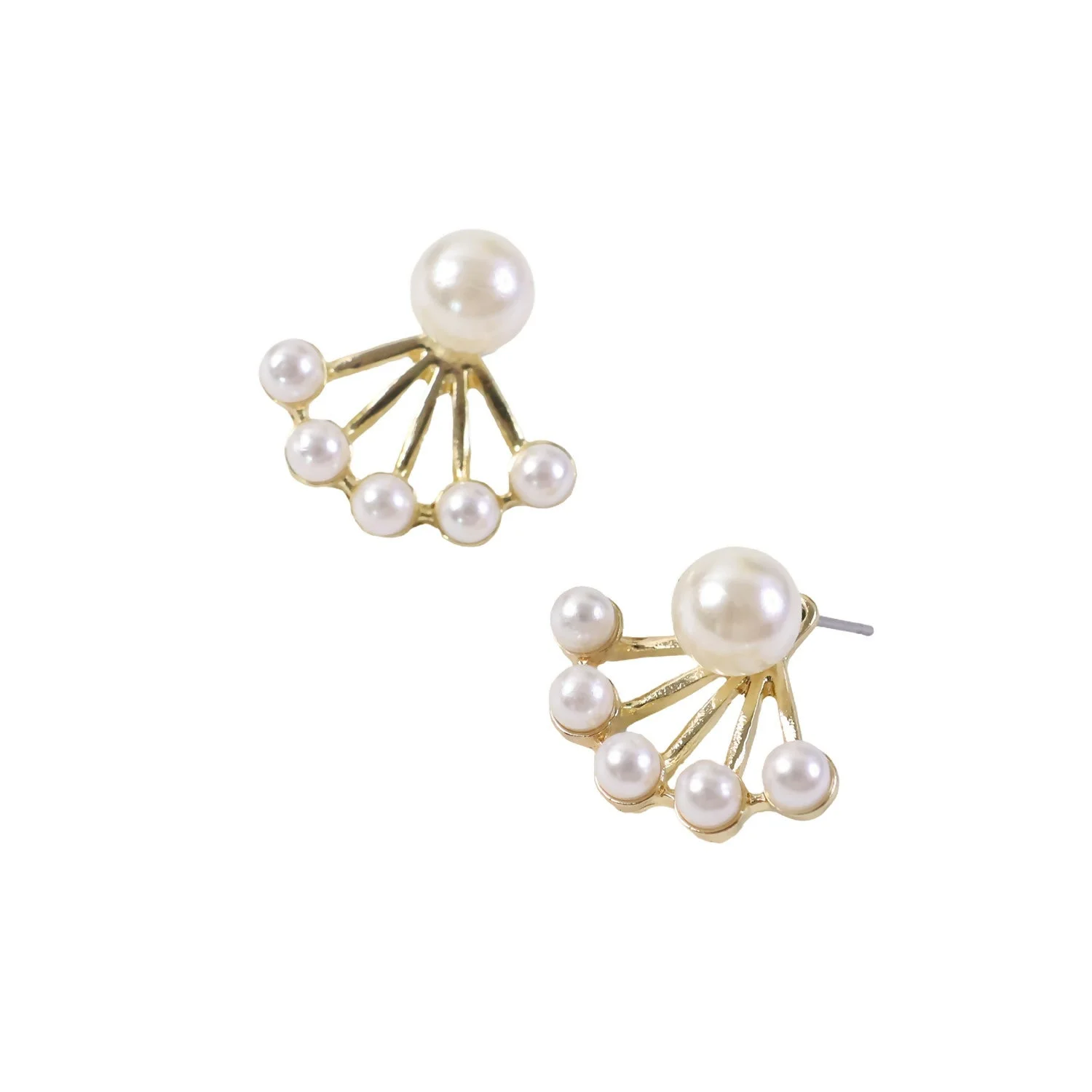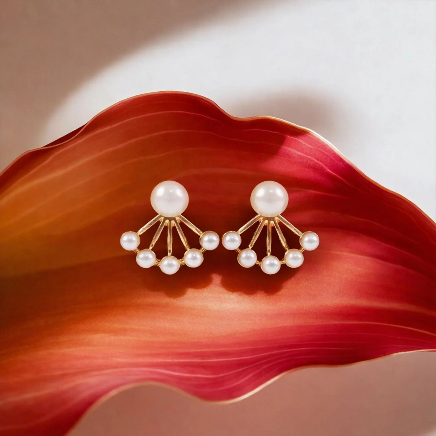 These elegant pearl stud earrings feature a unique fan-shaped design that looks graceful and stylish. The top is finished with a classic round pearl, while the lower part is beautifully arranged with small pearl beads in a semi-circle pattern, giving a royal and classy appearance. The golden framework adds a premium touch and makes the earrings stand out without looking heavy. Perfect for daily wear, office wear, festive functions, and party looks, these earrings match both traditional and western outfits. A lovely choice for gifting, they add a soft, feminine charm to any jewellery collection.