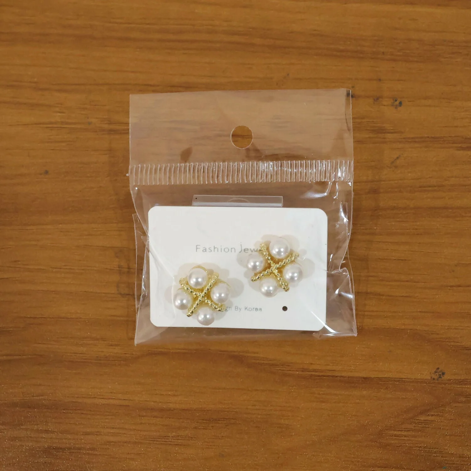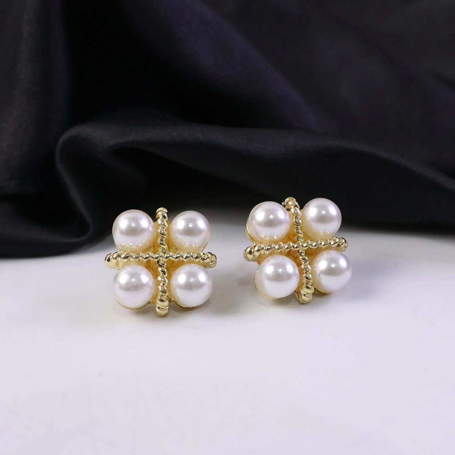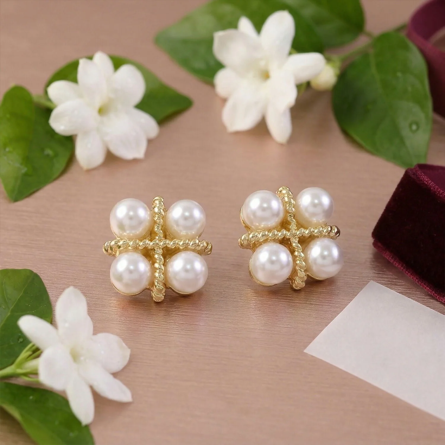 Design: These studs feature a striking "X" or cross-shaped metal base with a textured, twisted gold rope finish. A cluster of four lustrous white pearls is nestled within each gold frame, creating a balanced and eye-catching geometric cluster that is both bold and graceful.