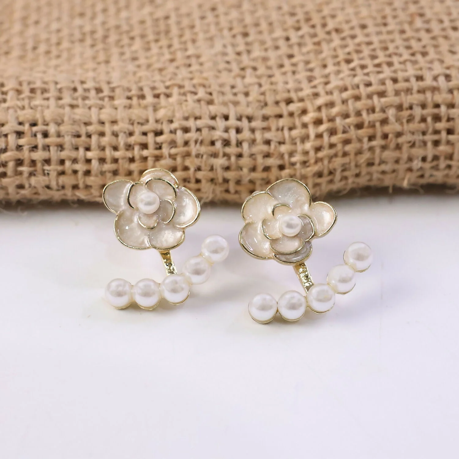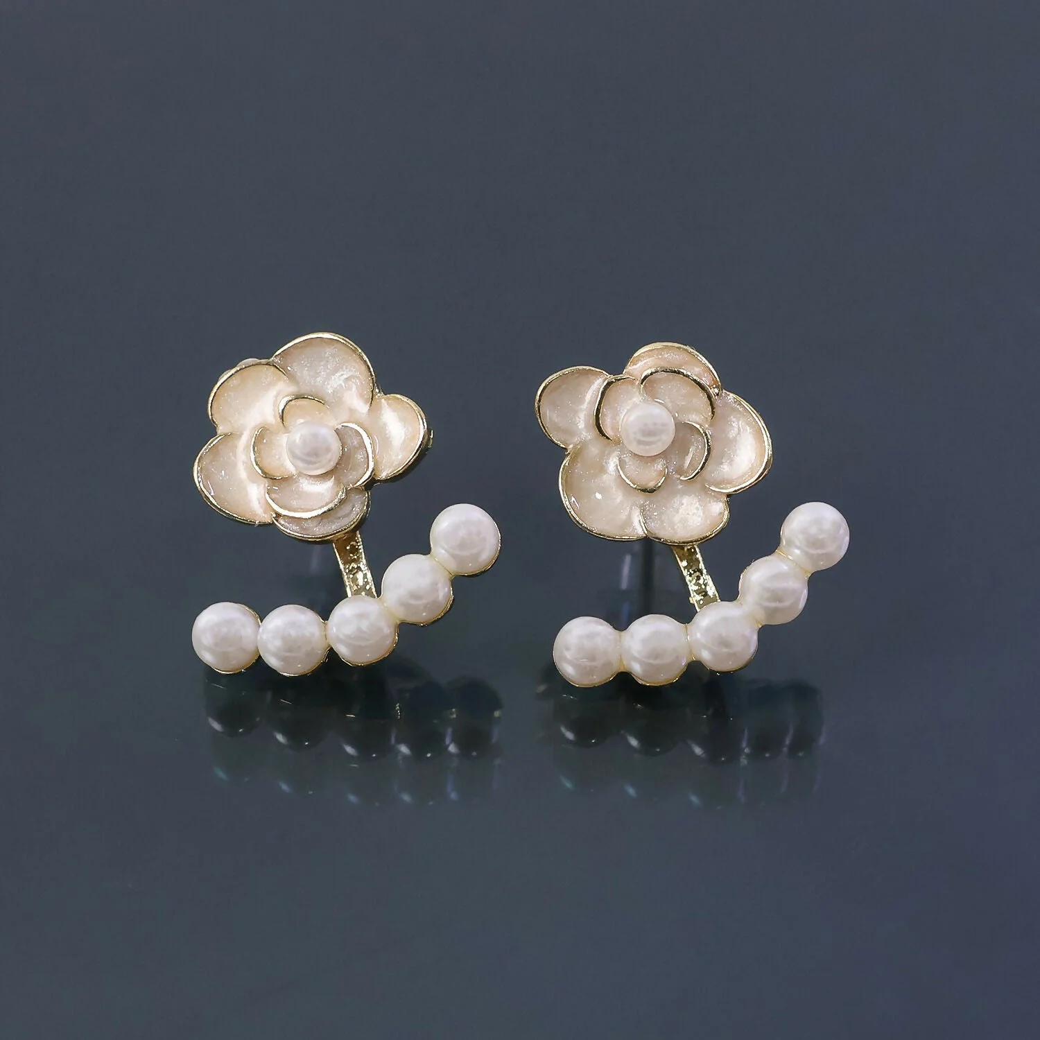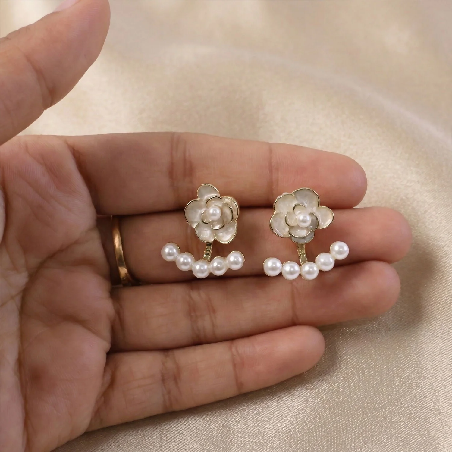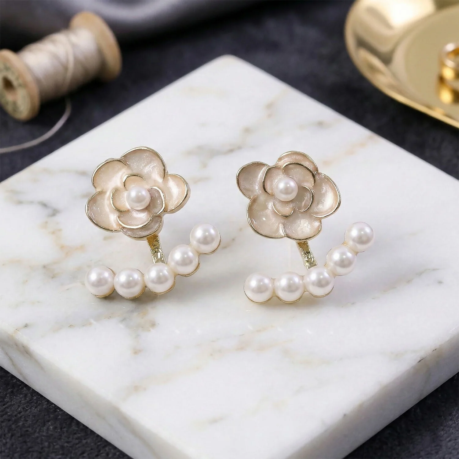 Design: These earrings feature a beautifully enameled white camellia rose as the main stud. Below the earlobe sits a curved "jacket" of five delicate pearls that follow the natural contour of your ear, creating a sophisticated and tiered look.