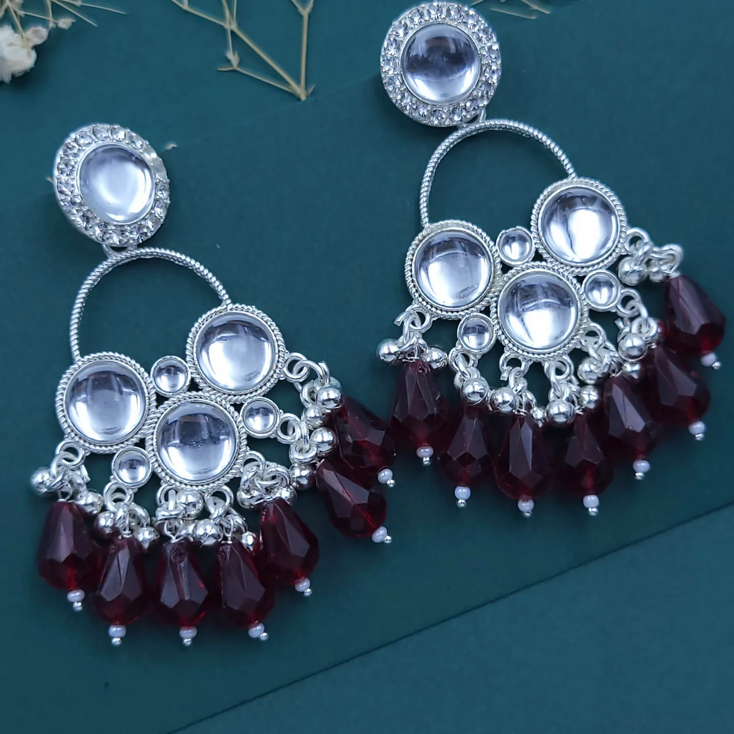Accents: Deep burgundy teardrop beads.