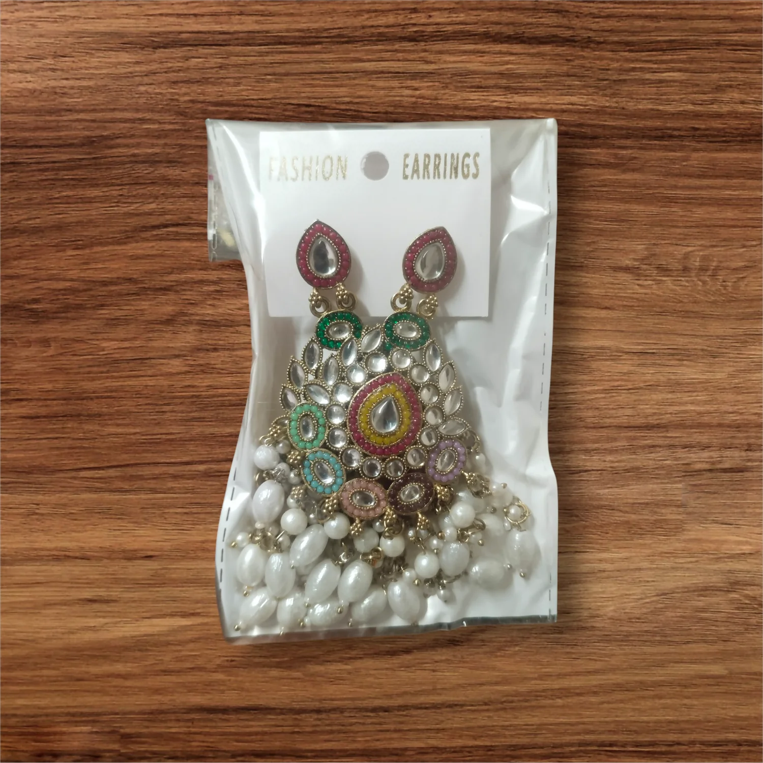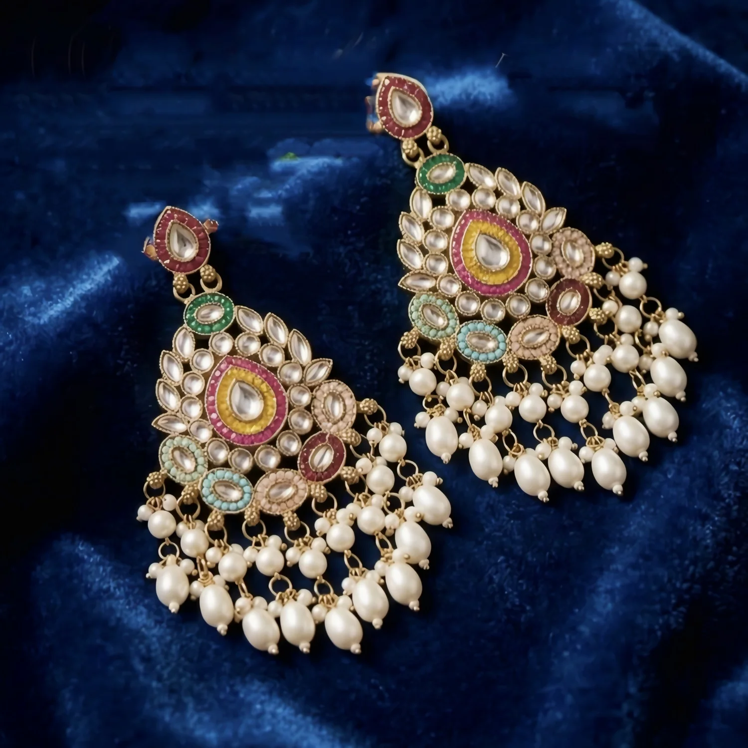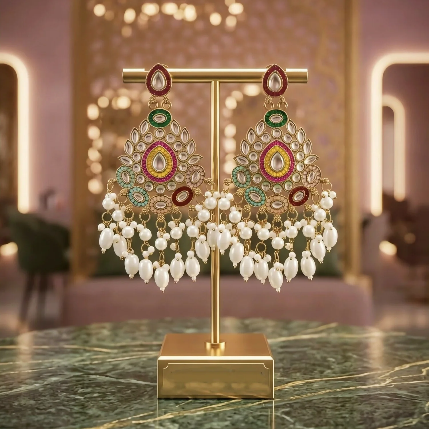 This stunning pair of earrings is a masterclass in traditional Indian craftsmanship, blending the regal elegance of Kundan work with a vibrant, multi-colored palette. Designed for the woman who loves to make a statement, these oversized Chandbali-style earrings are perfect for weddings, festive celebrations, and high-glamour events.