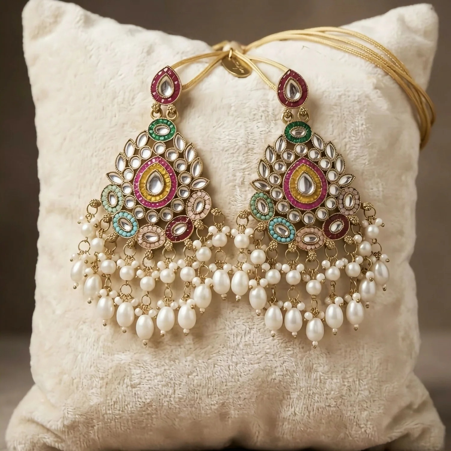 Be the first to review Kundan & Meenakari Handcrafted Chandbali Earrings with Pearl Drops!