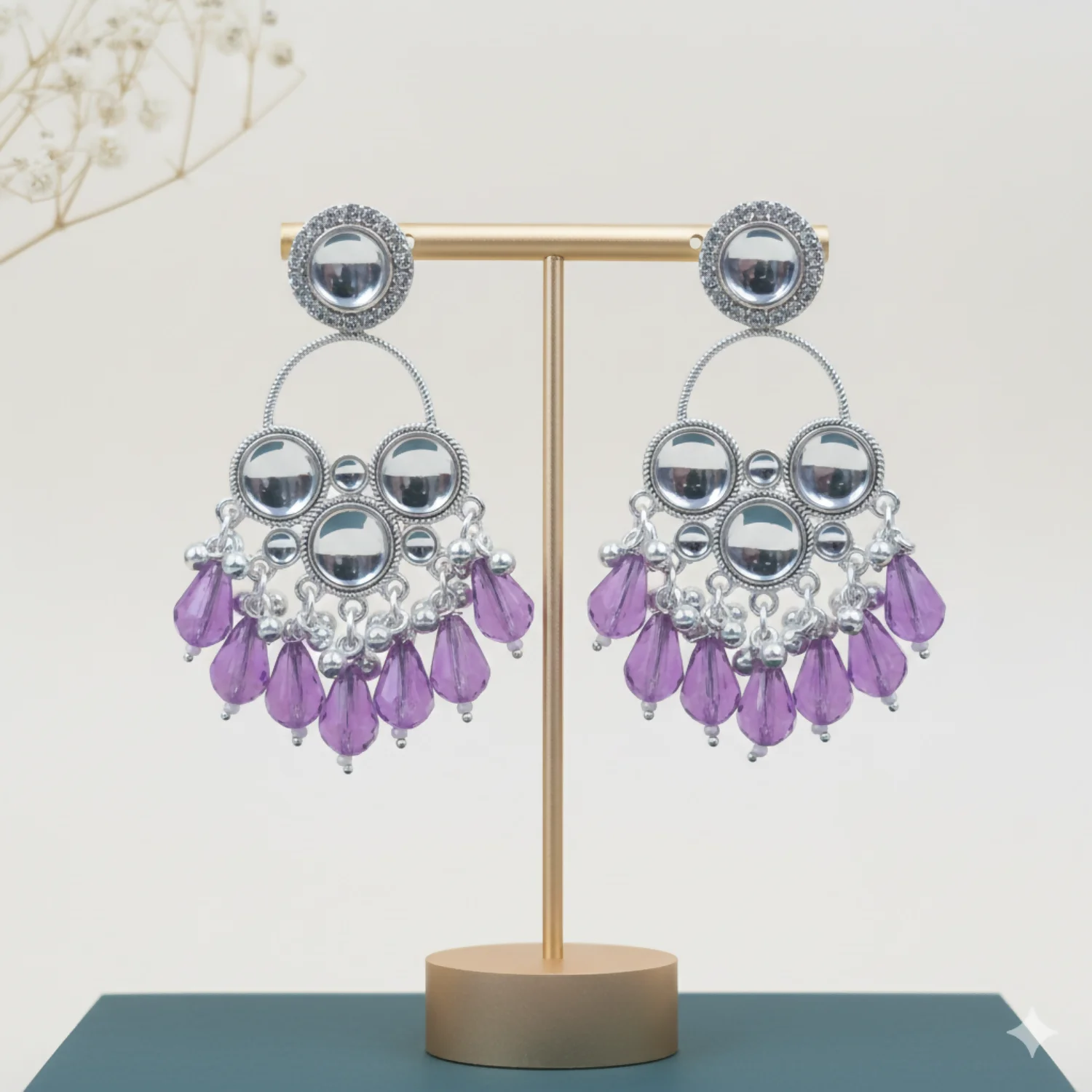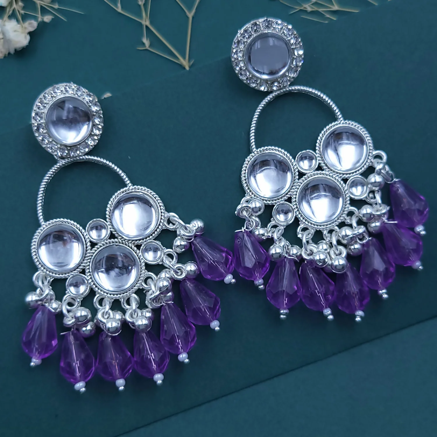 Design: Intricate circular studs with a cascading hoop frame.