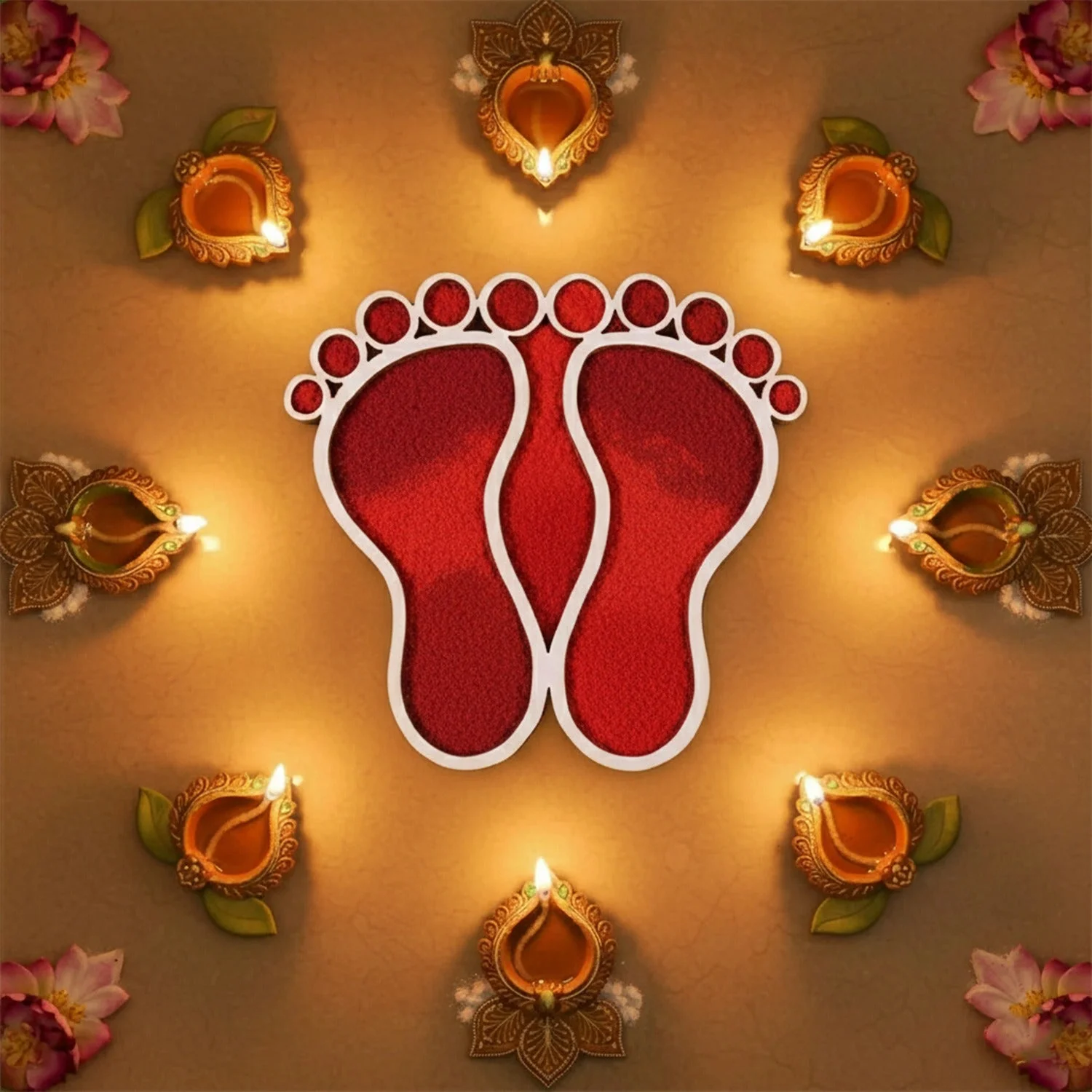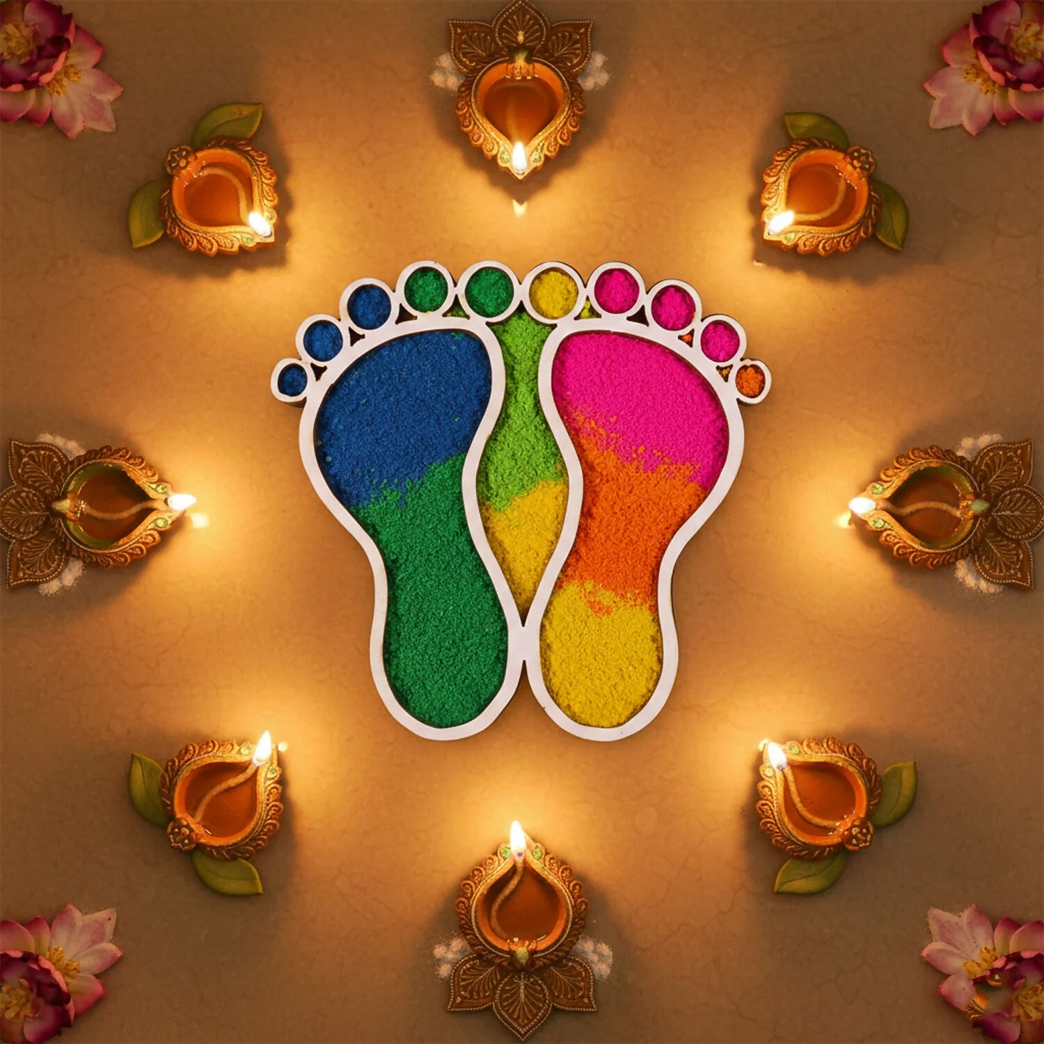 This Lakshmi Charan MDF design is used to make Maa Lakshmi’s feet using rangoli colours. Just place it, fill colours, lift, and you get a clean traditional feet look. Reusable and easy to keep for any occasion and on daily basis.