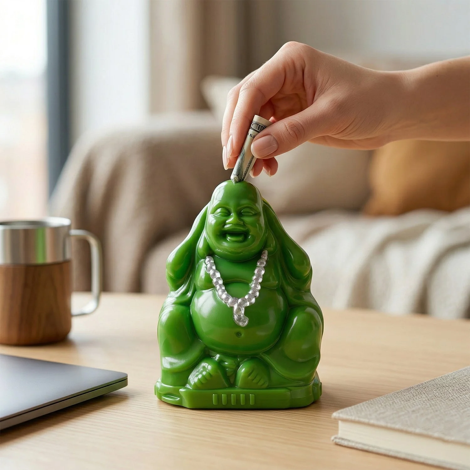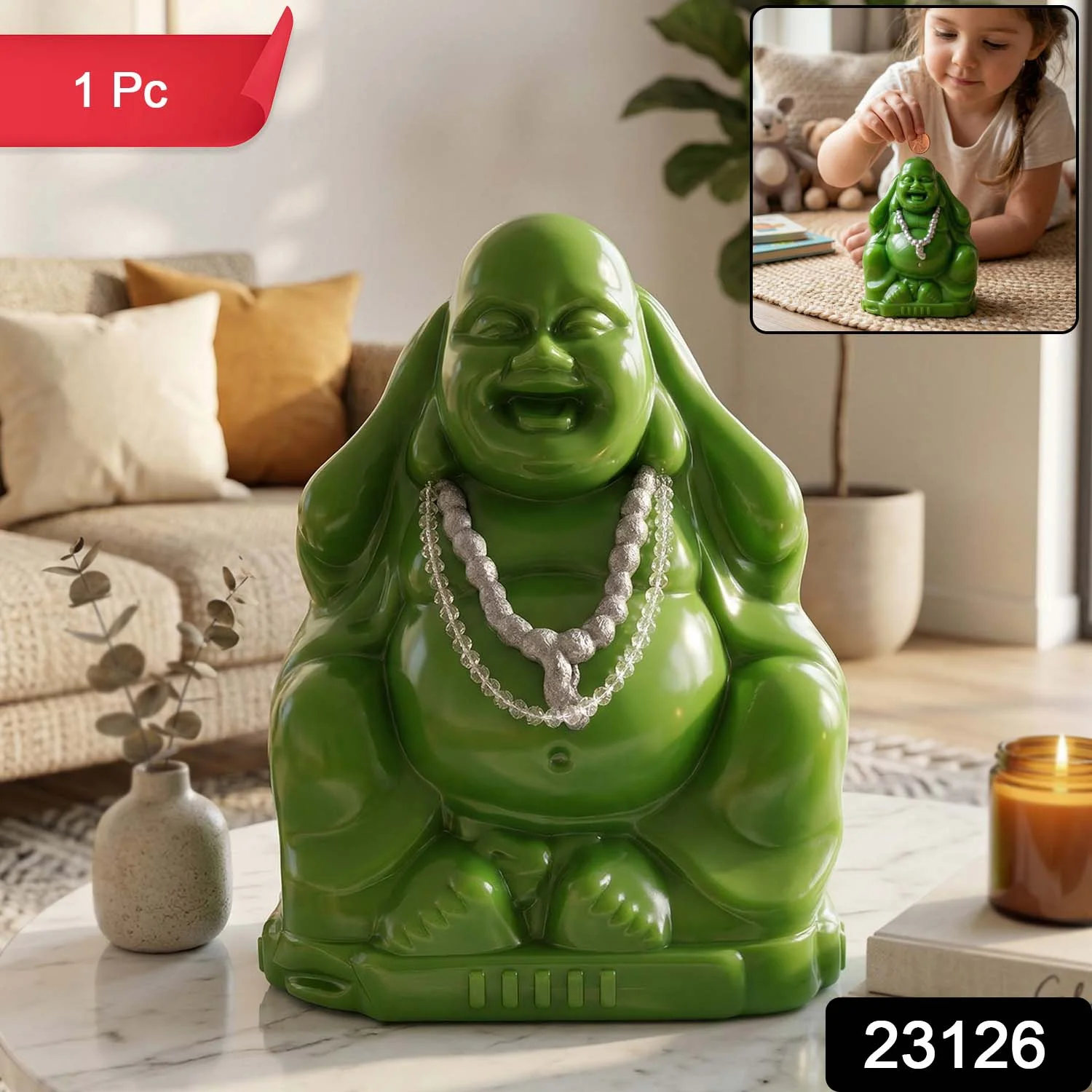 Bring positivity, prosperity, and functionality into your space with this beautifully designed Laughing Buddha money bank coin saving box. Crafted to combine spiritual symbolism with practical use, this coin bank helps you save money while also enhancing your home décor. The cheerful Laughing Buddha design is believed to attract good luck, happiness, and wealth, making it a meaningful addition to any room. Perfect for both kids and adults, it encourages saving habits in a fun and decorative way. Ideal as a thoughtful gift or a stylish décor piece for your living space.