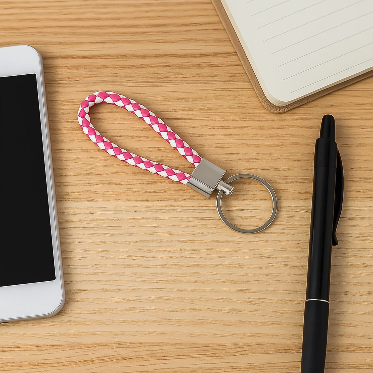Keep your keys organized in style with this braided leather-style keychain featuring a strong metal key ring. Designed with a hand strap loop, this key holder provides a secure grip and makes it easy to carry your keys anywhere. The braided two-tone design gives it a modern, fashionable look while ensuring durability for everyday use. Ideal for car keys, bike keys, home, and office keys, this compact and lightweight keychain also makes a thoughtful gift item.