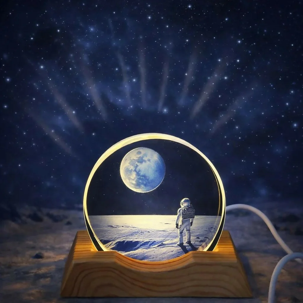 astronaut lamp, moon light lamp, acrylic LED lamp, space theme lamp, night light for bedroom, desk decor lamp, kids room light, decorative LED lamp, wooden base lamp, galaxy lamp, ambient light lamp, gift lamp, mini night lamp, modern decor light