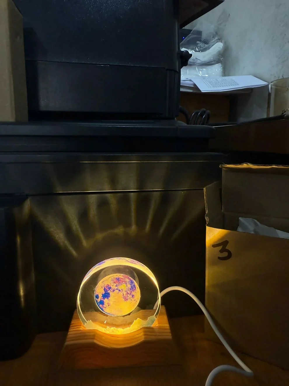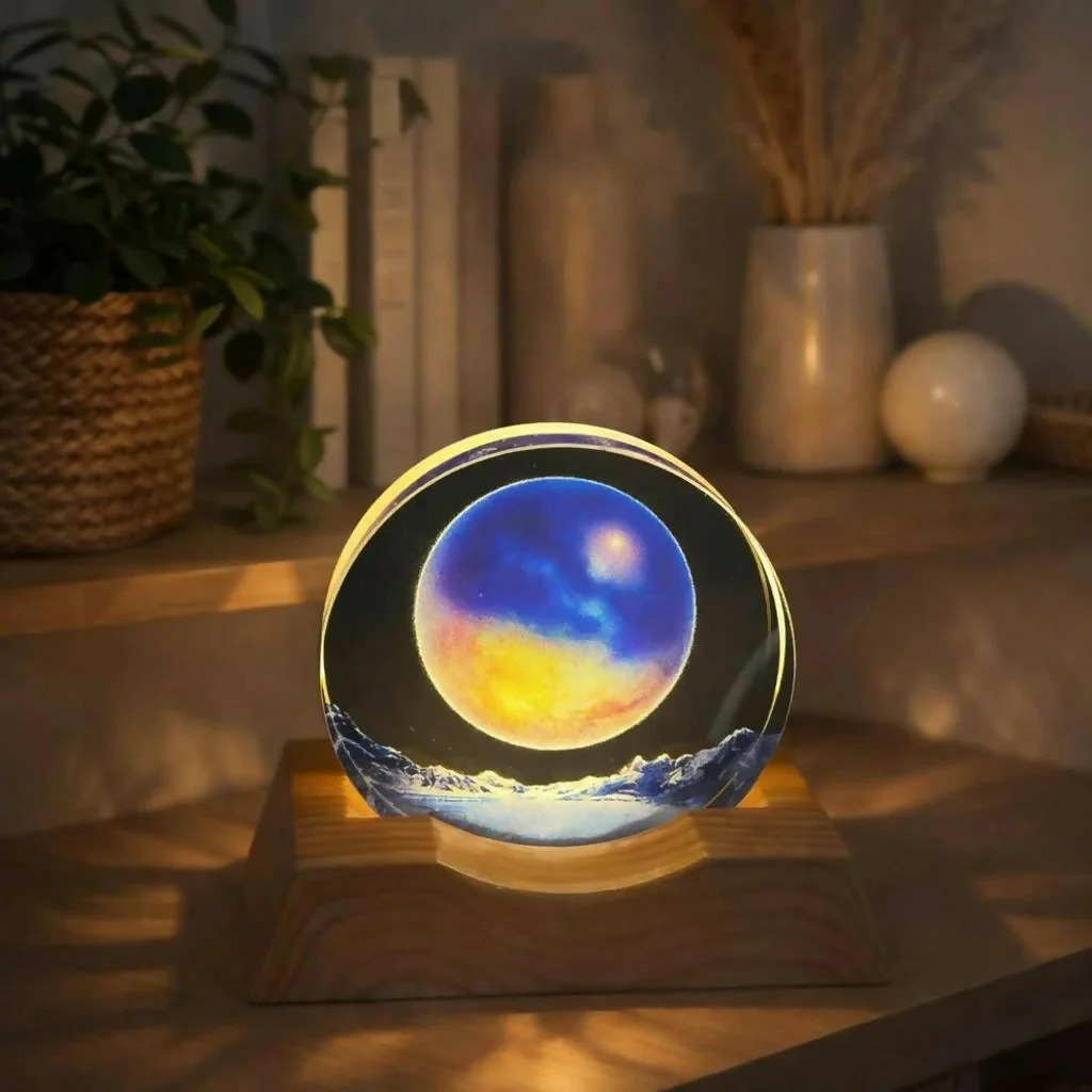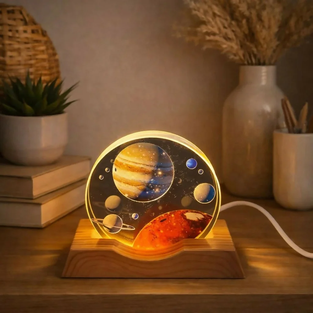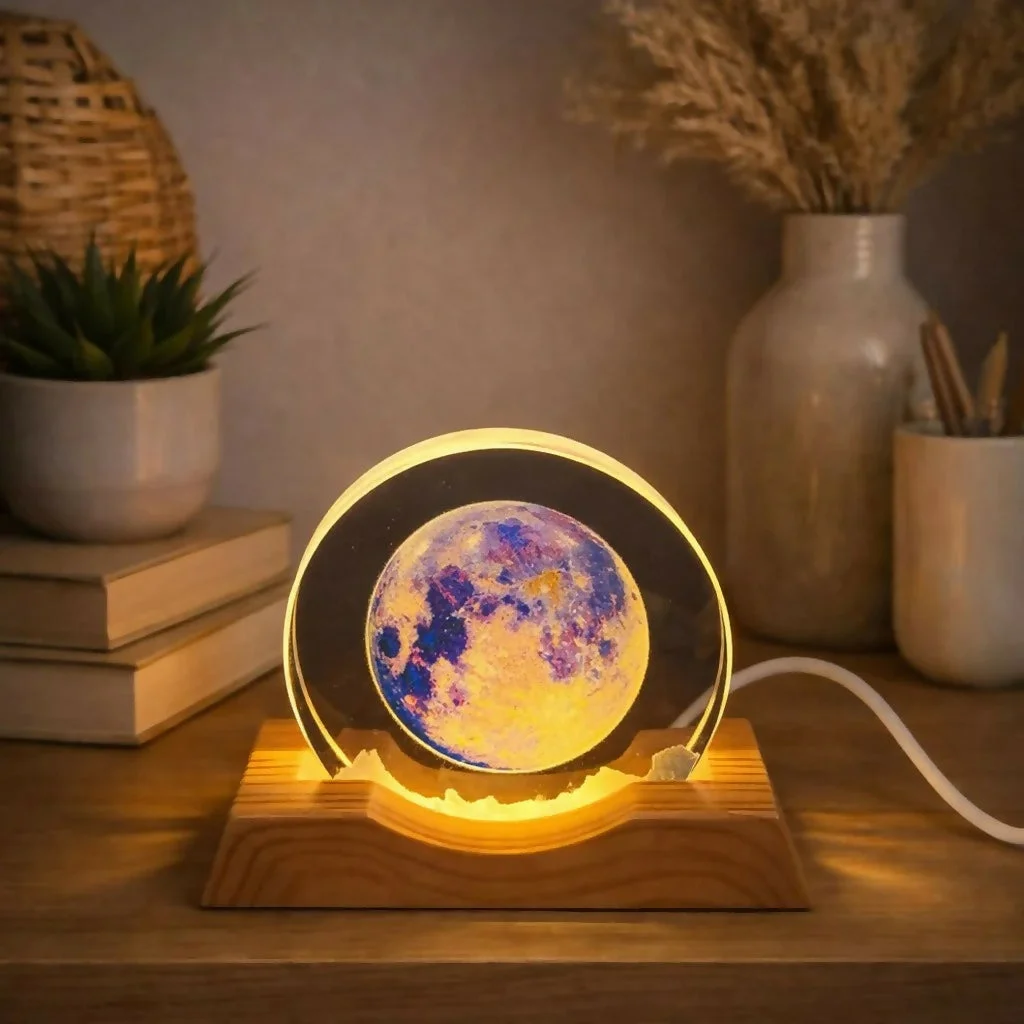 Create a calming and dreamy atmosphere with this LED astronaut moon acrylic lamp. Featuring a detailed space-themed design with an astronaut standing under the moon, this lamp glows beautifully when placed on its wooden base. The soft LED light reflects through the engraved acrylic panel, producing a stunning visual effect. Perfect for bedrooms, desks, or gifting, this decorative lamp adds a modern and soothing touch to any space.