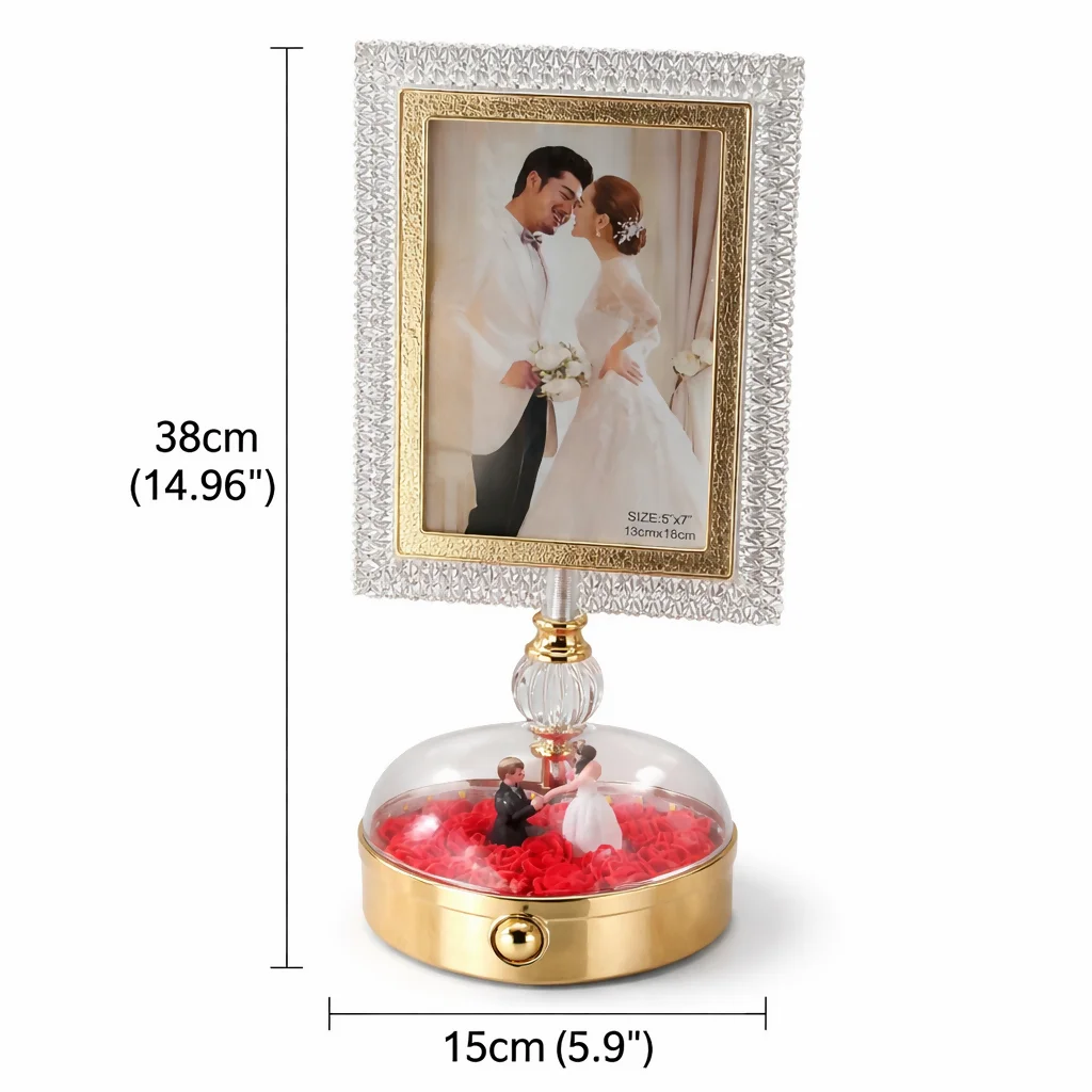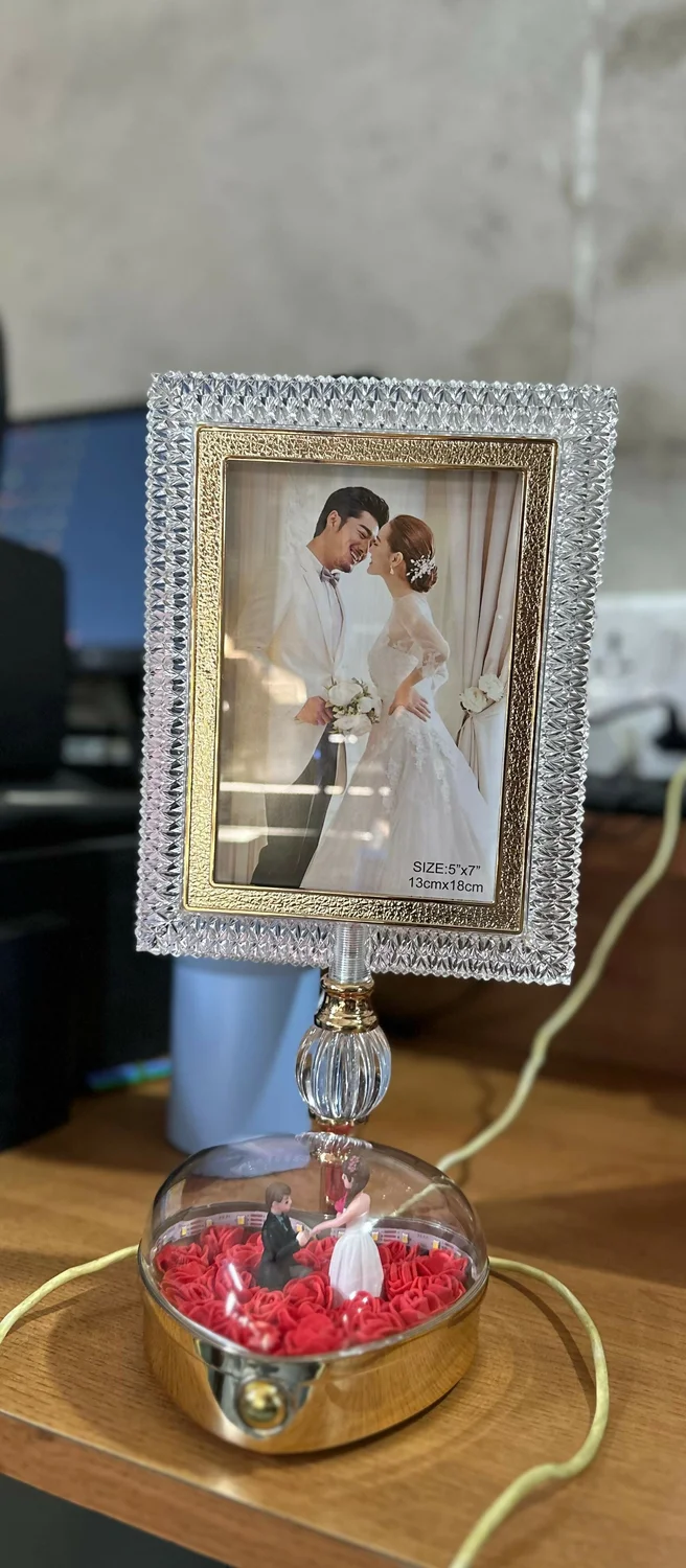 Enhance your space with this elegant LED crystal photo frame lamp, designed to add a romantic and premium touch to any room. Featuring a beautifully textured crystal frame and a decorative base with a couple figurine surrounded by rose petals, this piece combines lighting and décor in one. The soft LED illumination highlights your favorite memories while creating a warm ambiance. Perfect for bedroom desks, side tables, and gifting on special occasions like anniversaries and weddings.