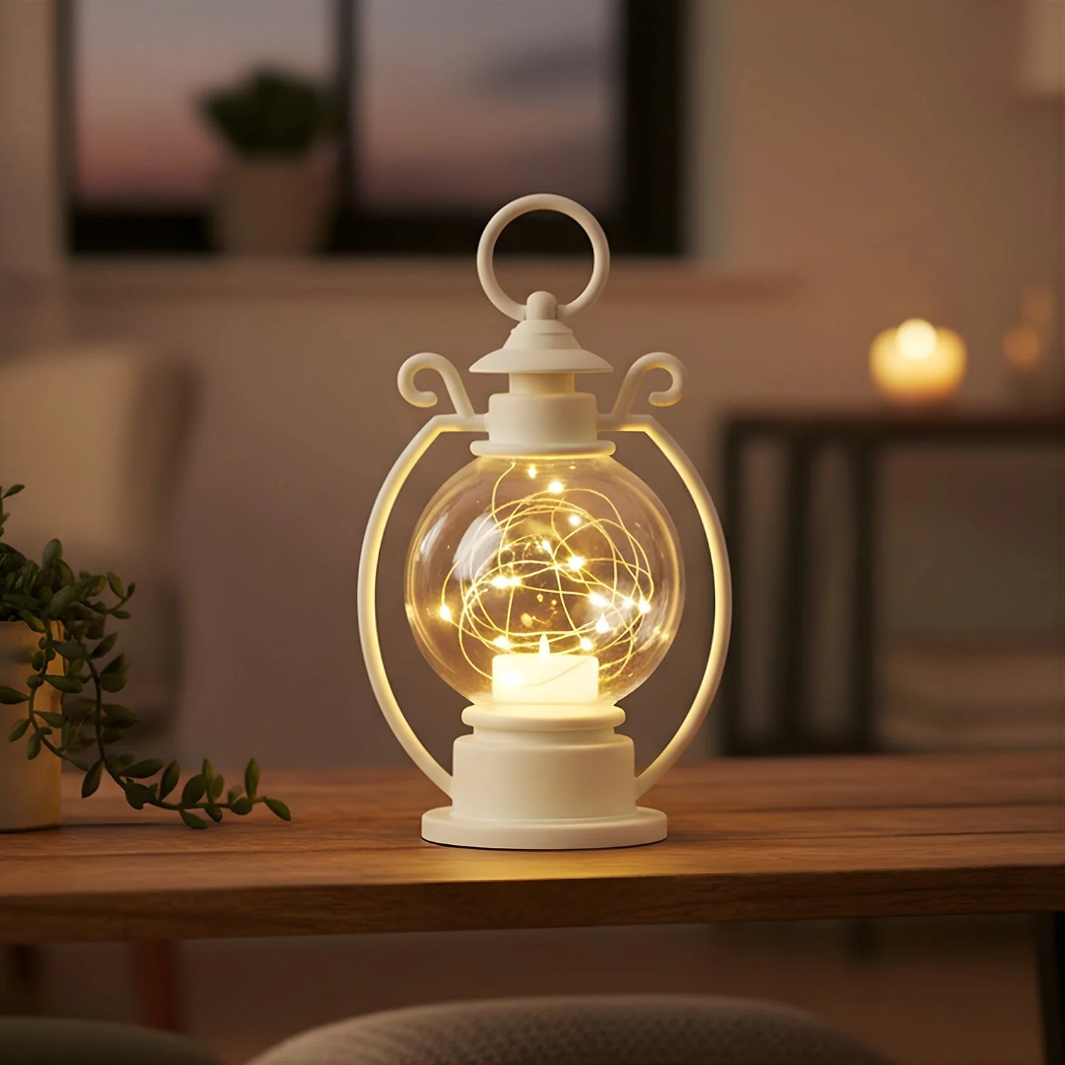 This LED Storm Lantern Light beautifully blends vintage charm with modern convenience, making it a stunning decorative piece for any space. Designed with a transparent glass globe and a classic metal-style frame, it creates a soft, warm white glow that enhances ambiance and coziness. The integrated LED fairy string inside the lantern offers an elegant twinkle effect, perfect for both indoor and outdoor settings.