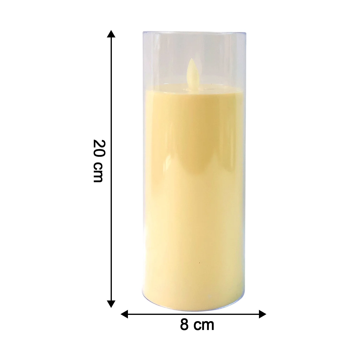 LED candle , flameless candle , battery operated candle , pillar candle , tall candle , glowing candle , home decor , festive decoration , Diwali decoration , cylindrical LED candle , tall pillar candle , modern LED candle , luxury LED candle , glass candle light , artificial pillar candle , flameless tall candle , glowing cylinder candle