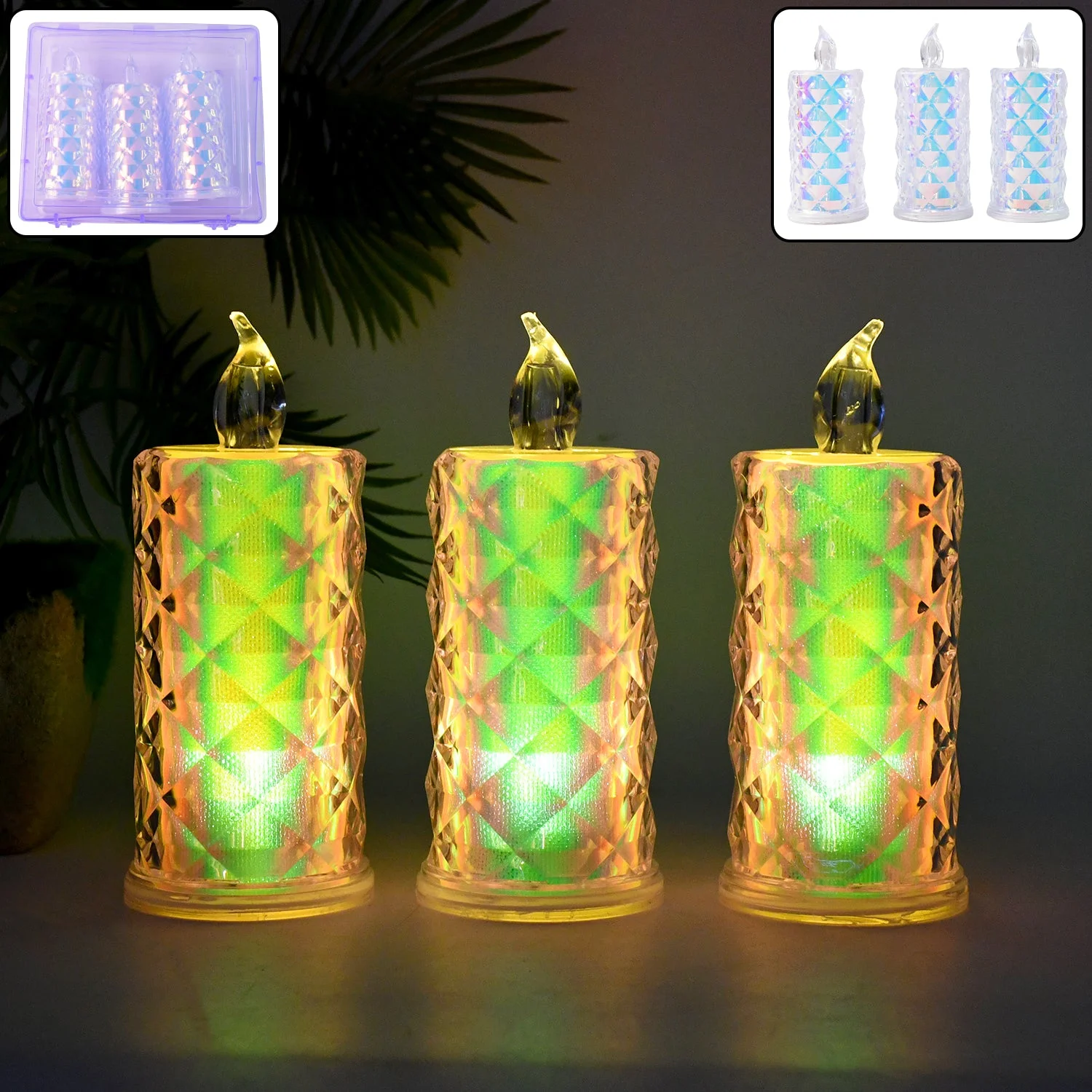 Set of 3 LED Flameless Decorative Candle Lights with Multicolor Changing Glow – Crystal Pattern Flameless Candles for Home Décor, Festivals, Parties & Gifting, Diwali Item