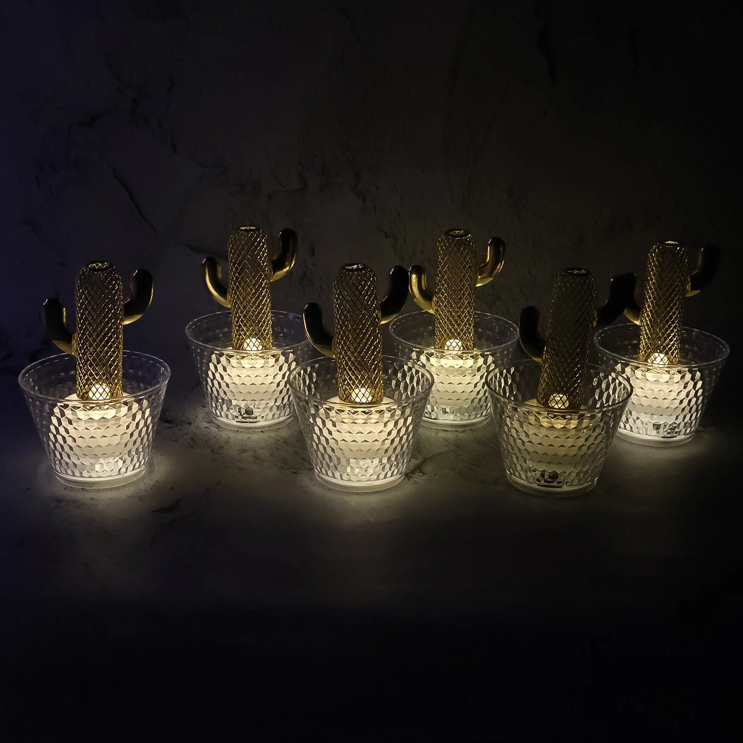 Add a stylish and playful touch to your décor with this set of 6 Cactus Design LED Flameless Candles. Each light comes with a golden cactus-shaped LED placed inside a crystal-effect cup holder, creating a warm and inviting glow. Battery operated and completely flameless, these candles are safe, reusable, and perfect for enhancing ambiance without the hazards of traditional candles. Their unique cactus design makes them a decorative centerpiece for living rooms, parties, weddings, restaurants, and festive celebrations. Lightweight and durable, these LED lights combine creativity with practicality, making them a versatile décor accessory.