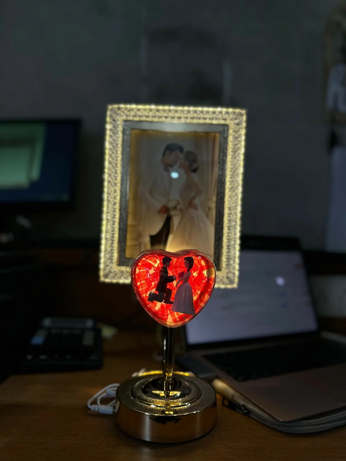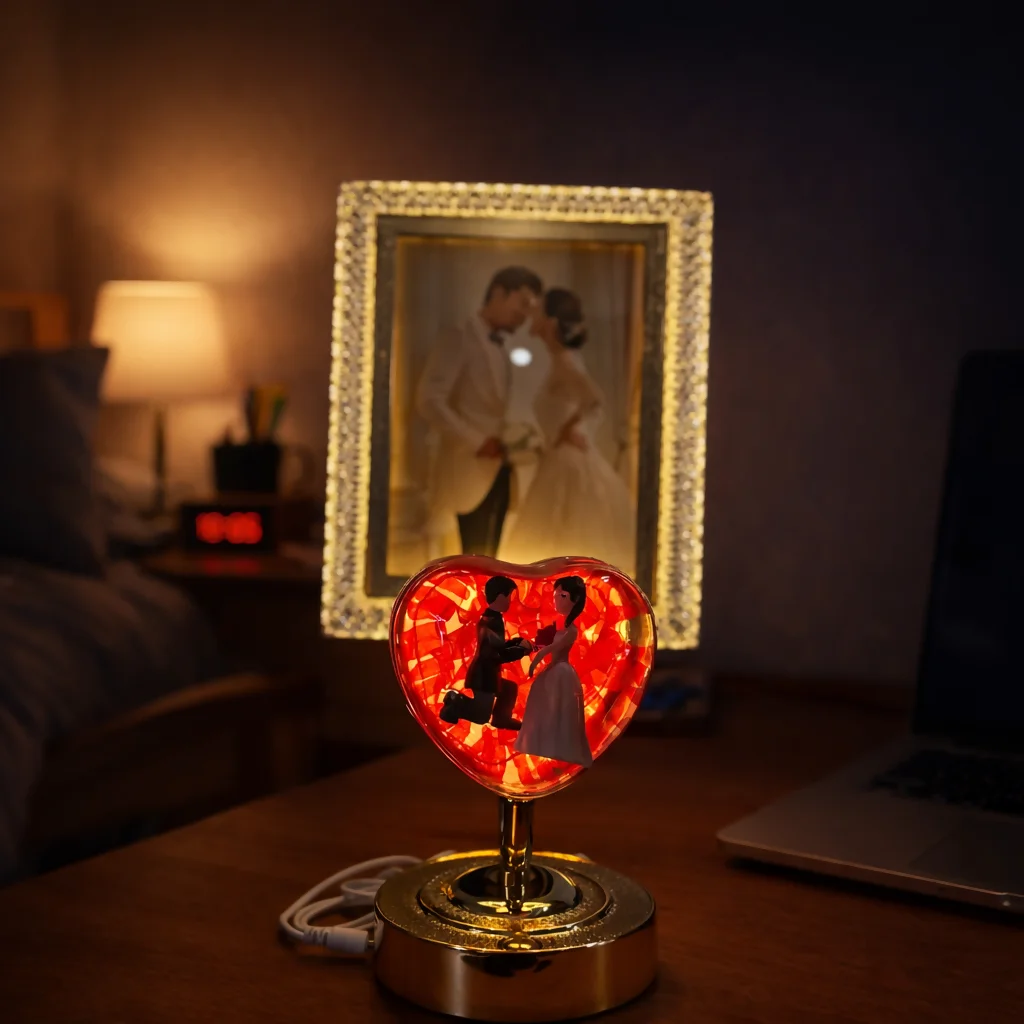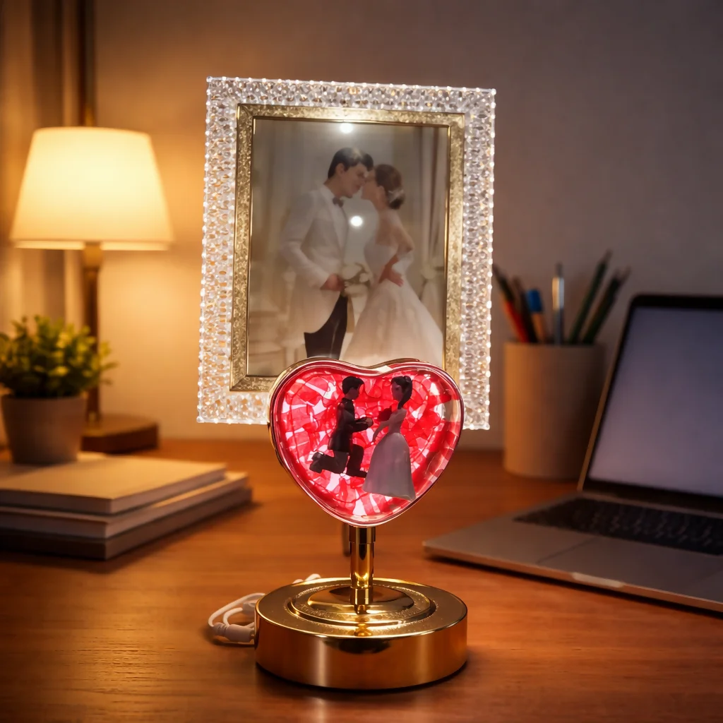 LED photo frame lamp, couple gift lamp, romantic heart lamp, decorative photo frame, bedroom table decor, anniversary gift for couples, wedding gift item, LED table lamp decor, love theme showpiece, home decor lighting, desk decoration lamp, couple figurine lamp