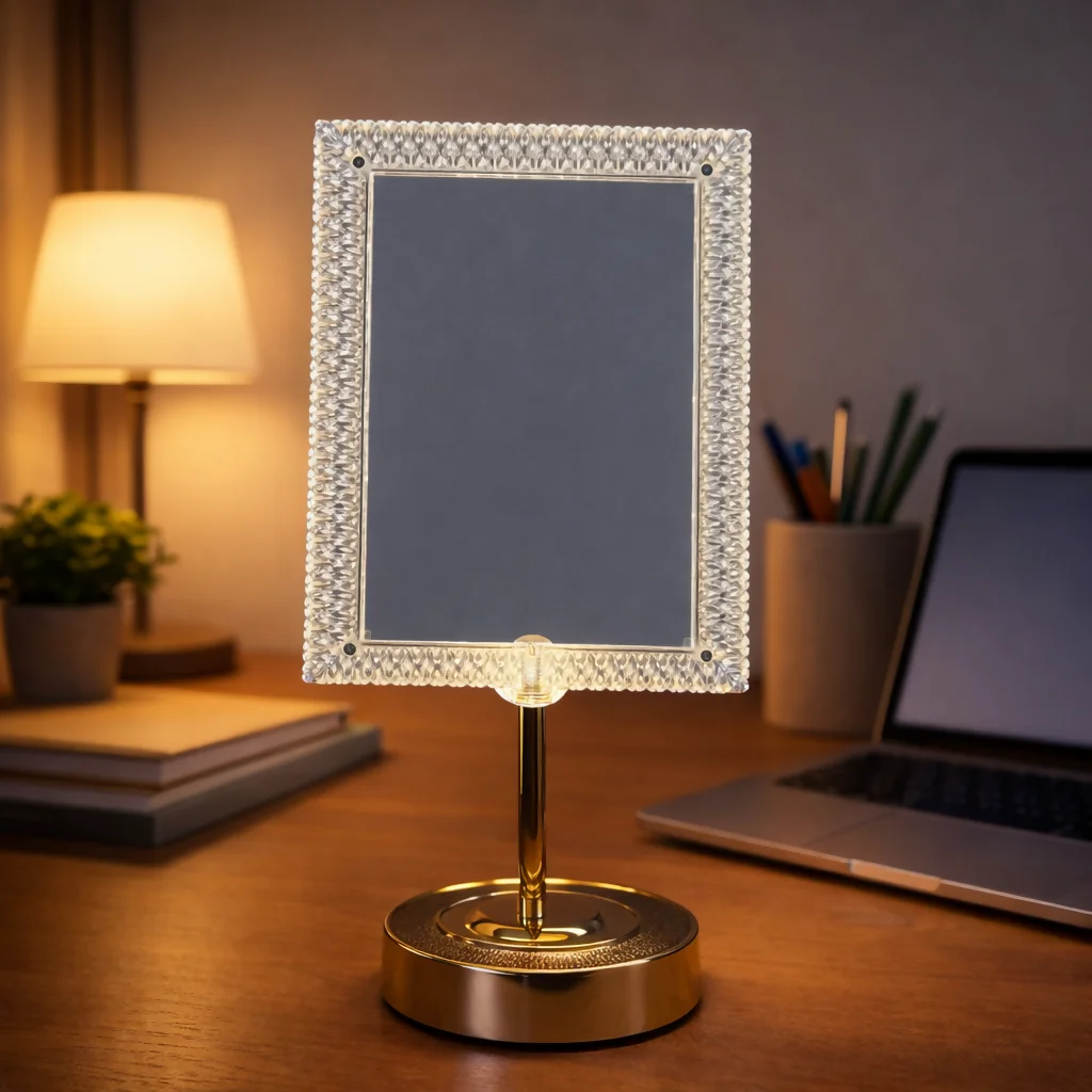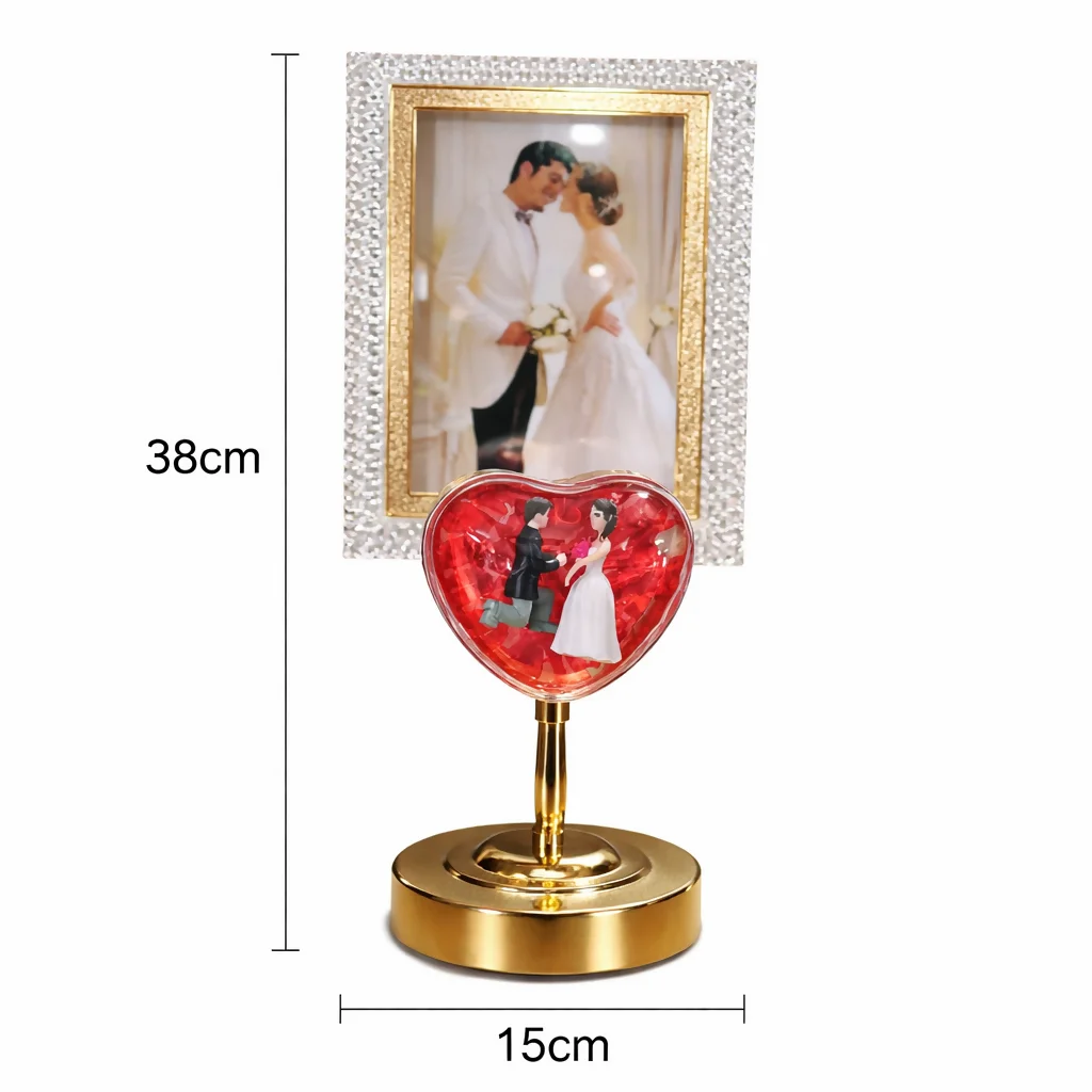 Enhance your home decor with this beautifully designed LED photo frame lamp featuring a romantic heart-shaped design. The upper frame holds your cherished photo, while the lower heart showcases a charming couple figurine, creating a perfect blend of emotion and elegance. The warm LED lighting adds a cozy ambiance, making it ideal for bedrooms, desks, or gifting purposes. Crafted with a stylish stand and crystal-like detailing, this decorative piece is perfect for special occasions like anniversaries, weddings, and birthdays.
