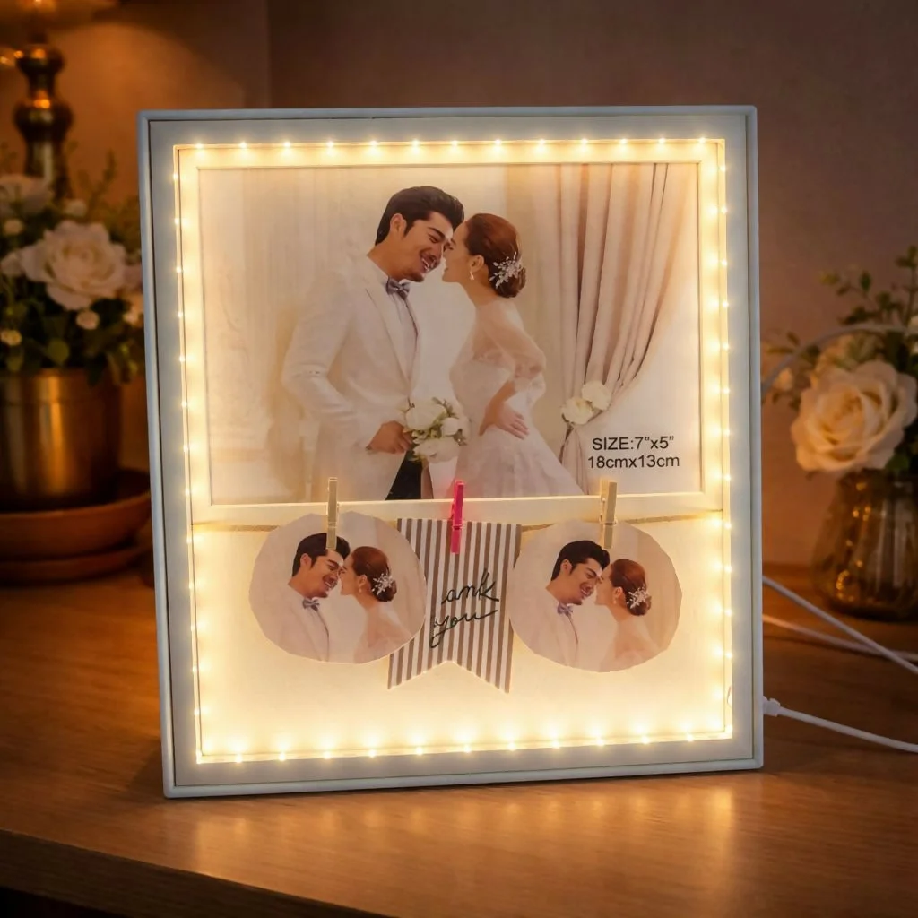 led photo frame 7x5, collage photo frame, photo frame with clips, decorative frame, couple photo frame, wedding gift frame, anniversary gift, glowing photo frame, home decor frame, table decor item, memory frame, led frame decor, clip photo frame, gift for couple, bedroom decor