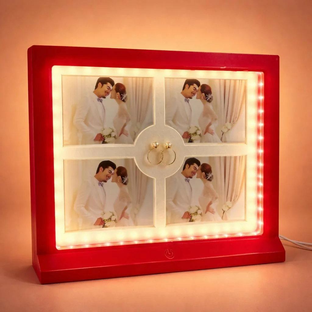 led photo frame, collage photo frame, 4 photo frame, decorative frame, couple photo frame, wedding gift frame, anniversary gift, glowing photo frame, home decor frame, table decor item, memory frame, led frame decor, photo collage frame, gift for couple, bedroom decor